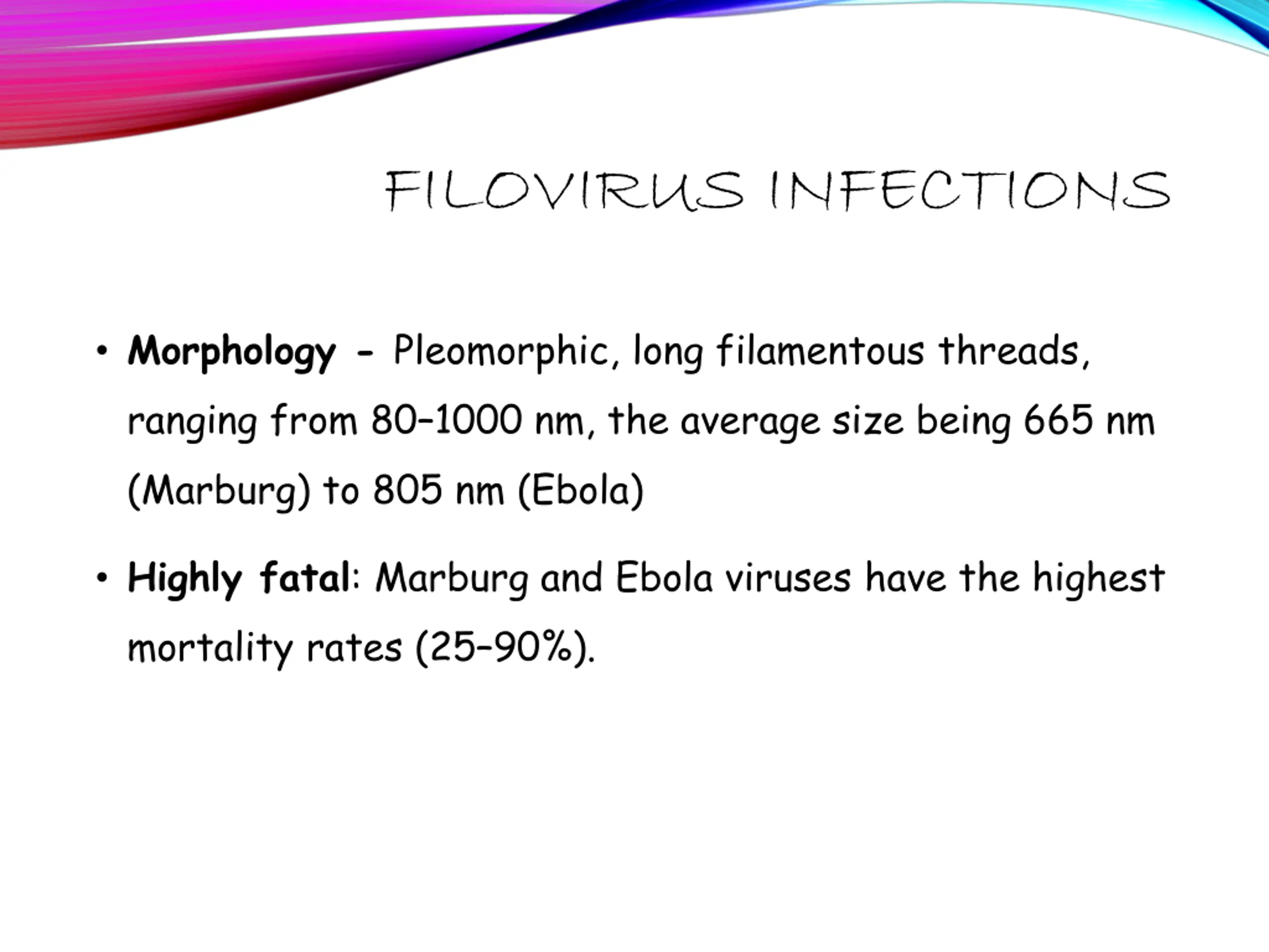 FILOVIRUS INFECTIONS Morphology - Pleomorphic, long filamentous threads, ranging from 80 1000 nm, the average size being 665 nm (Marburg) to 805 nm (Ebola) Highly fatal: Marburg and Ebola viruses have the highest mortality rates (25 90%).