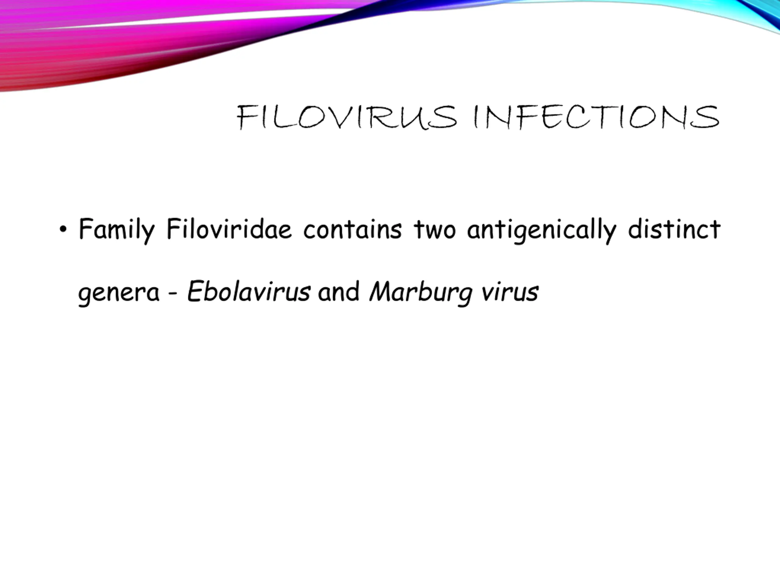 FILOVIRUS INFECTIONS Family Filoviridae contains two antigenically distinct genera - Ebolavirus and Marburg virus