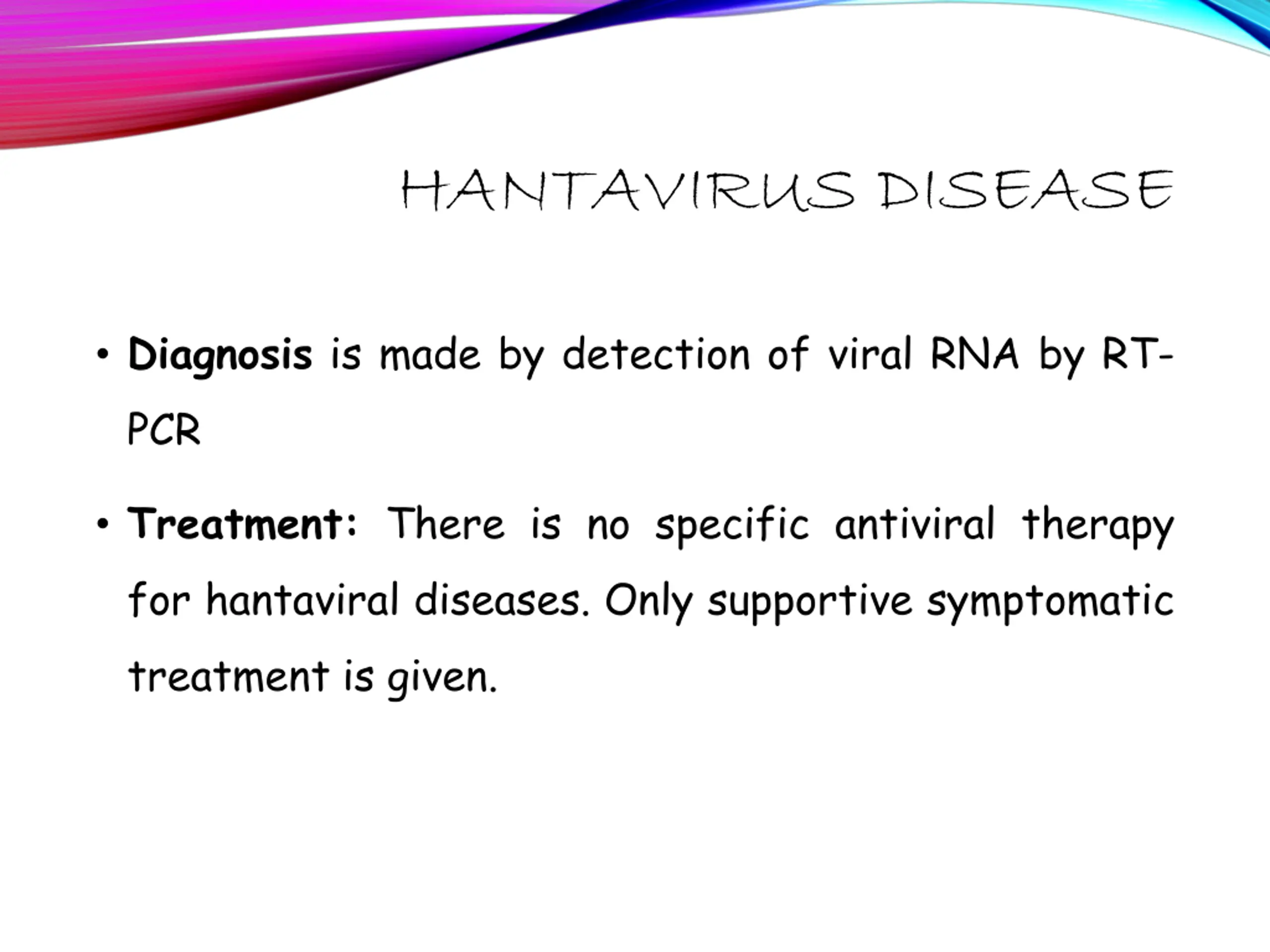 HANTAVIRUS DISEASE Diagnosis is made by detection of viral RNA by RT- PCR Treatment: There is no specific antiviral therapy for hantaviral diseases. Only supportive symptomatic treatment is given.