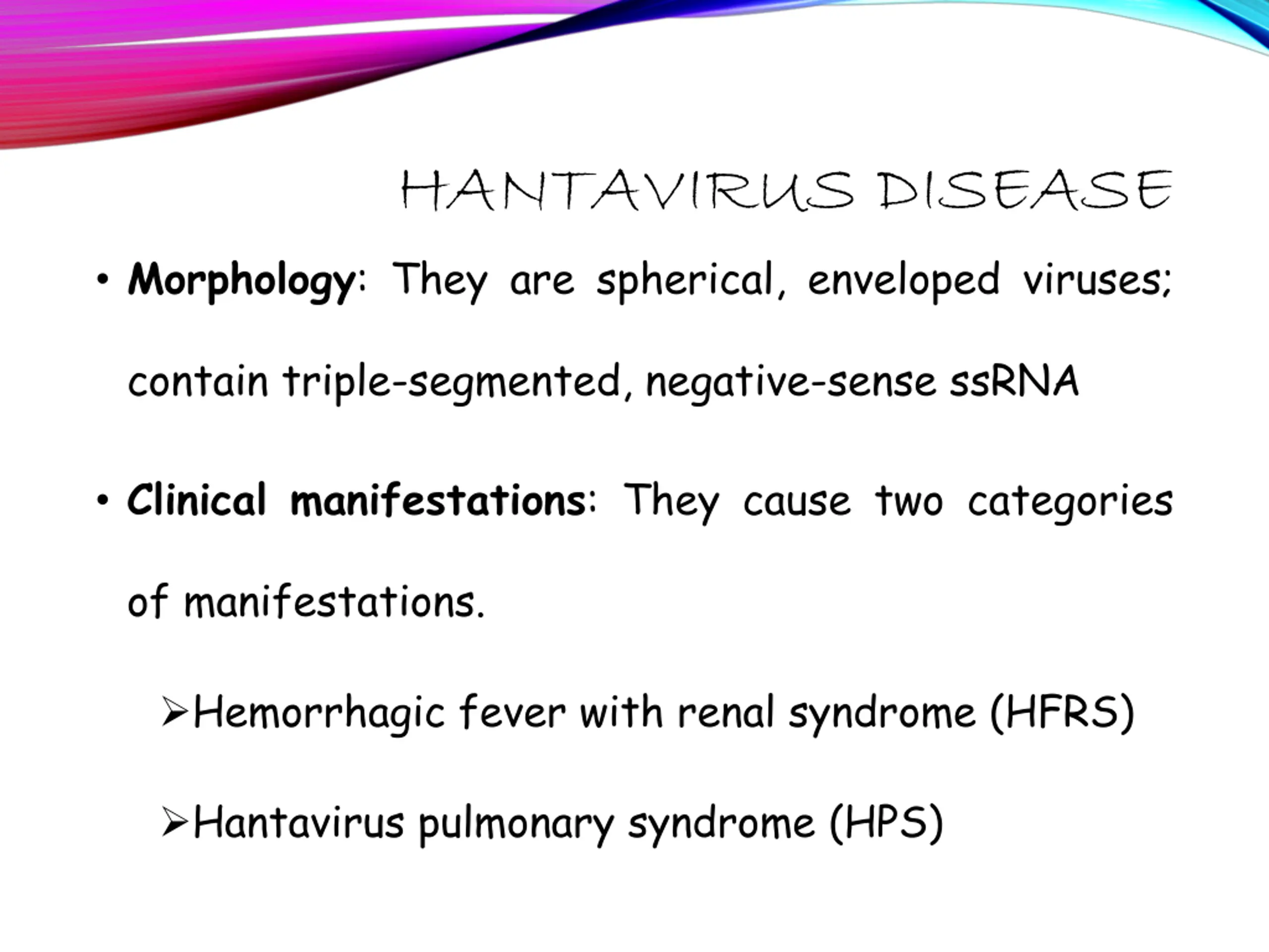 HANTAVIRUS DISEASE Morphology: They are spherical, enveloped viruses; contain triple-segmented, negative-sense ssRNA Clinical manifestations: They cause two categories of manifestations. Hemorrhagic fever with renal syndrome (HFRS) Hantavirus pulmonary syndrome (HPS)