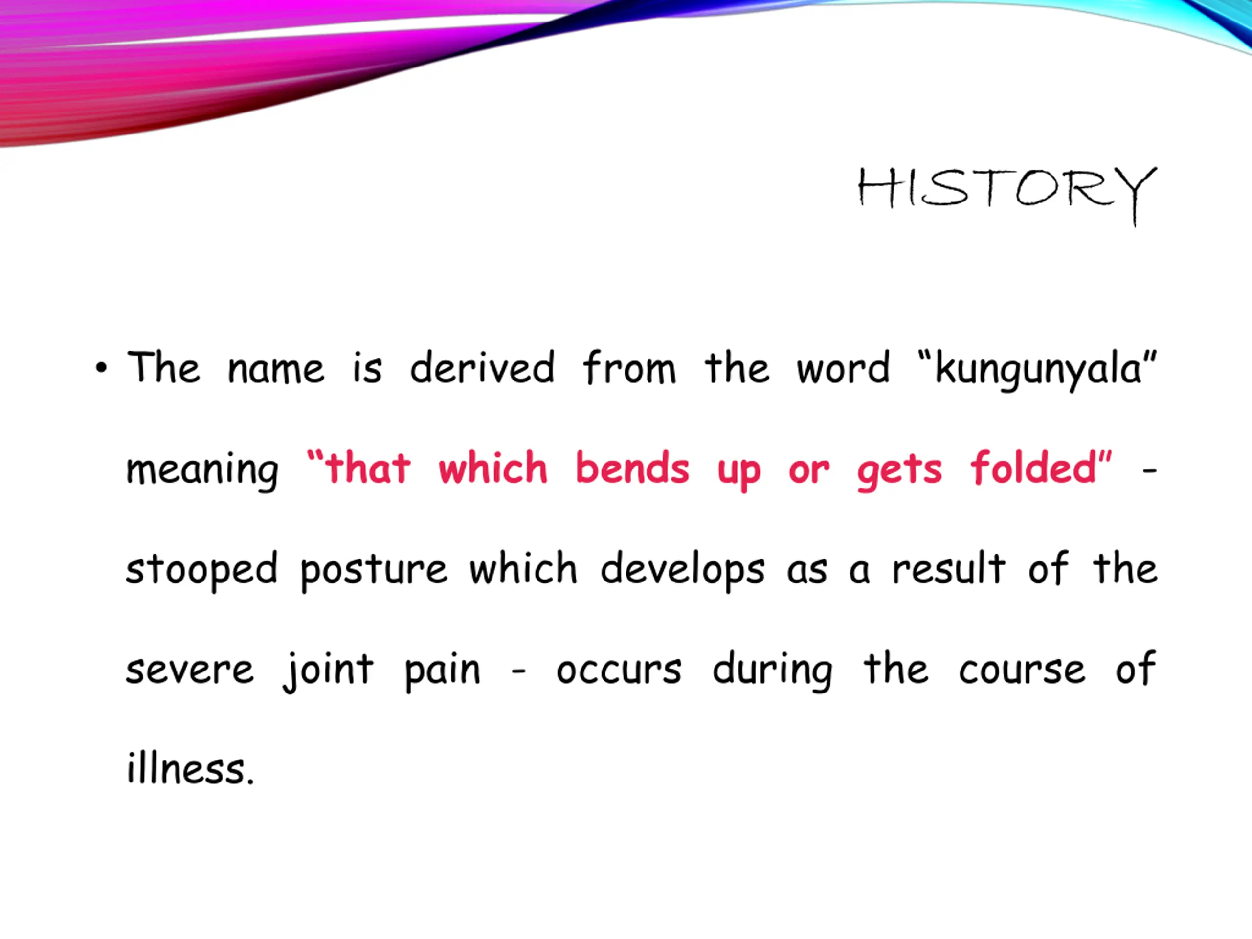 HISTORY The name is derived from the word kungunyala meaning that which bends up or gets folded - stooped posture which develops as a result of the severe joint pain - occurs during the course of illness.
