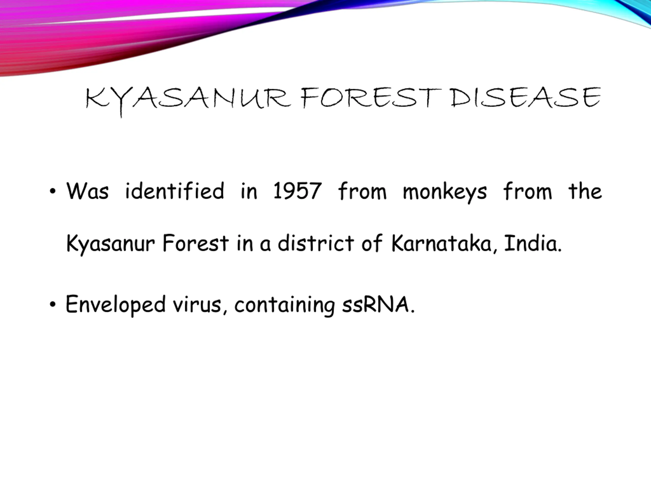 KYASANUR FOREST DISEASE Was identified in 1957 from monkeys from the Kyasanur Forest in a district of Karnataka, India. Enveloped virus, containing ssRNA.