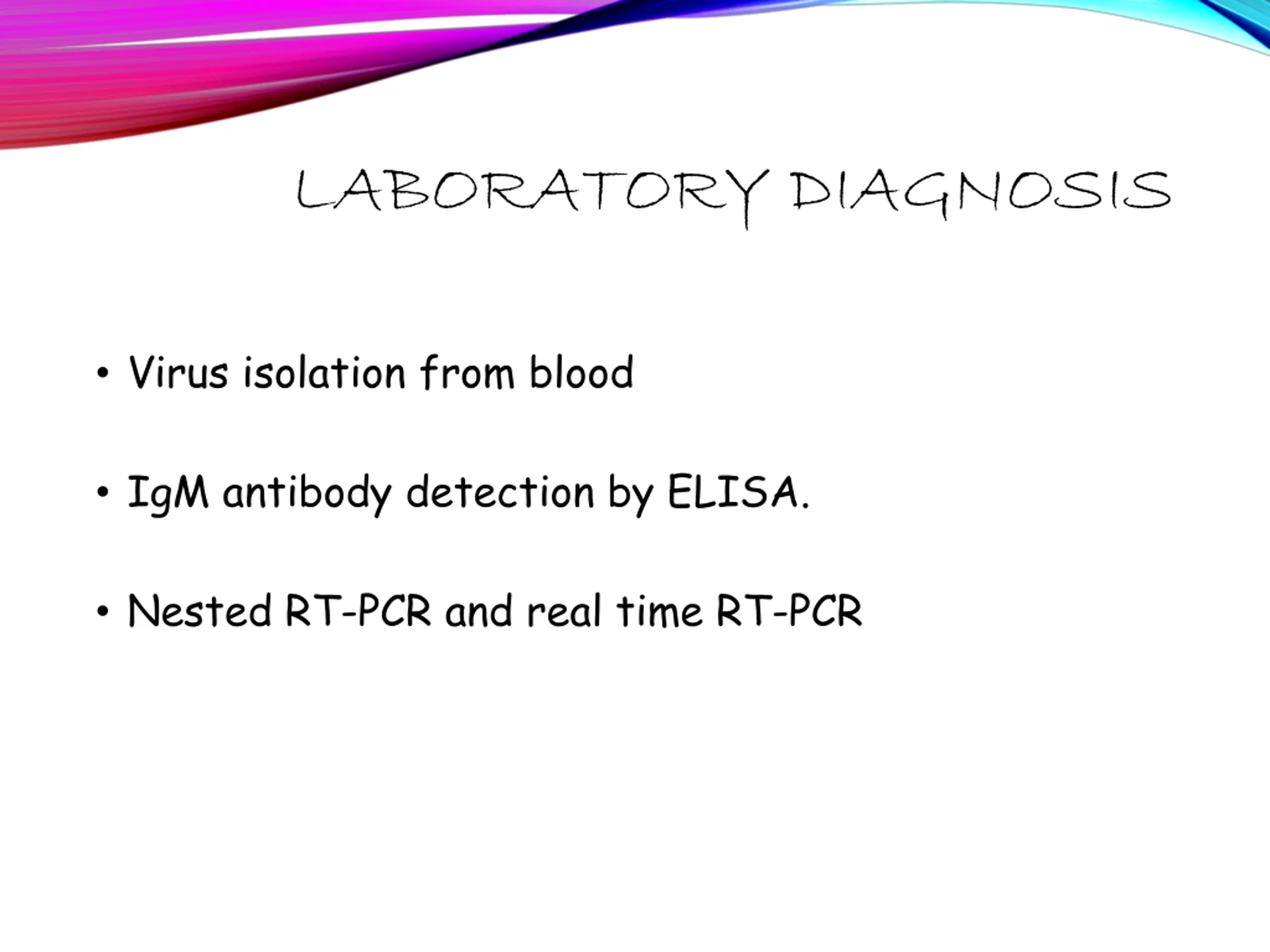 LABORATORY DIAGNOSIS Virus isolation from blood IgM antibody detection by ELISA. Nested RT-PCR and real time RT-PCR