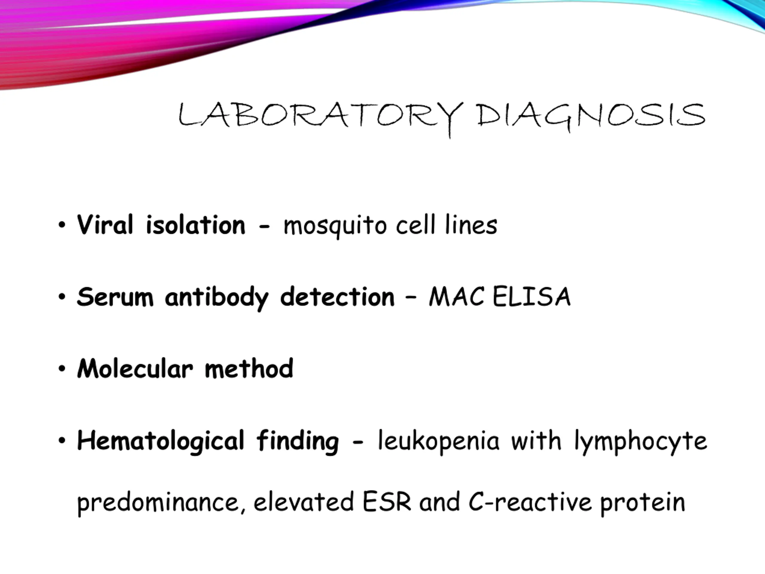 LABORATORY DIAGNOSIS Viral isolation - mosquito cell lines Serum antibody detection MAC ELISA Molecular method Hematological finding - leukopenia with lymphocyte predominance, elevated ESR and C-reactive protein