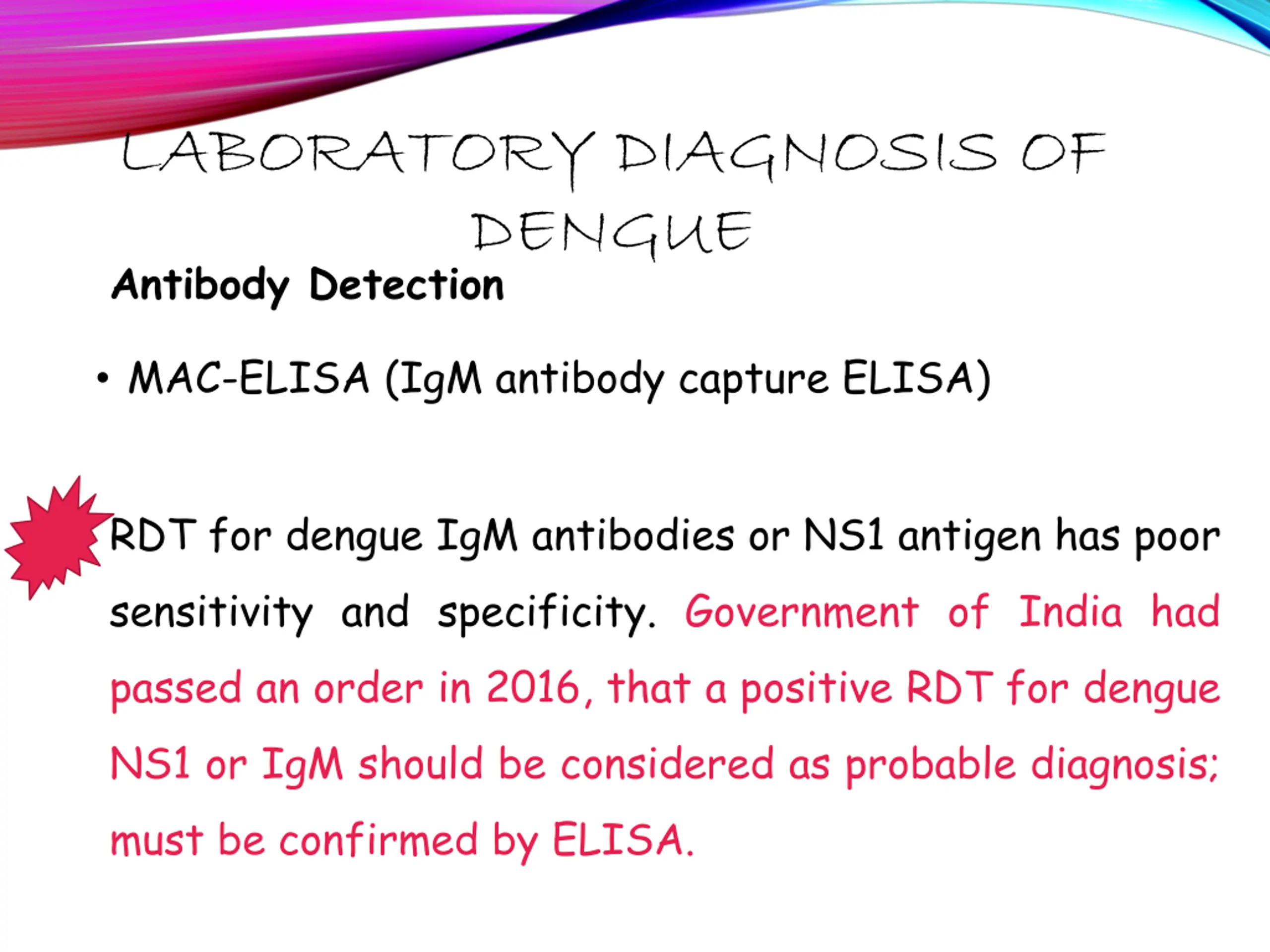 LABORATORY DIAGNOSIS OF DENGUE Antibody Detection MAC-ELISA (IgM antibody capture ELISA) RDT for dengue IgM antibodies or NS1 antigen has poor sensitivity and specificity. Government of India had passed an order in 2016, that a positive RDT for dengue NS1 or IgM should be considered as probable diagnosis; must be confirmed by ELISA.