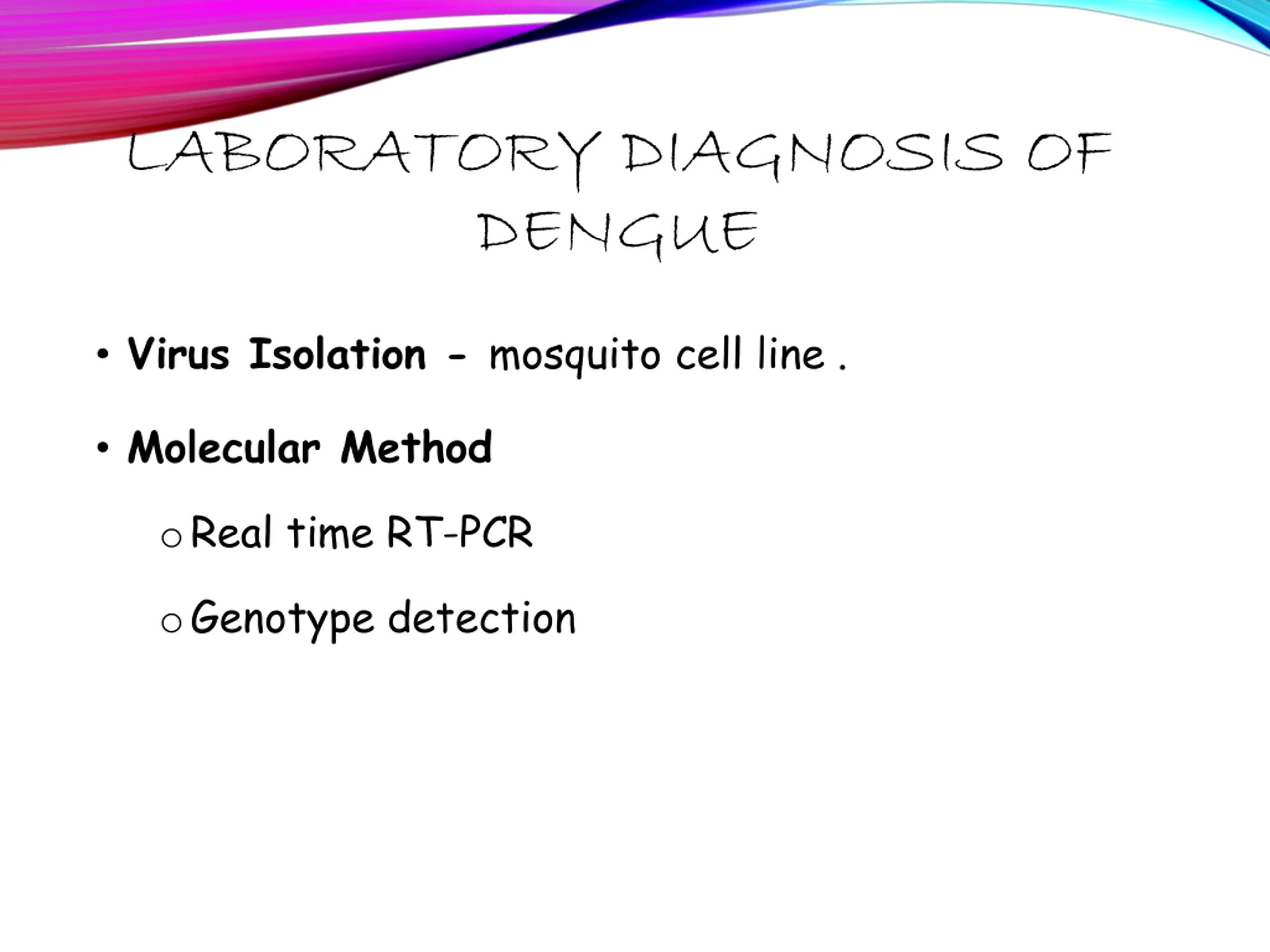 LABORATORY DIAGNOSIS OF DENGUE Virus Isolation - mosquito cell line . Molecular Method oReal time RT-PCR oGenotype detection