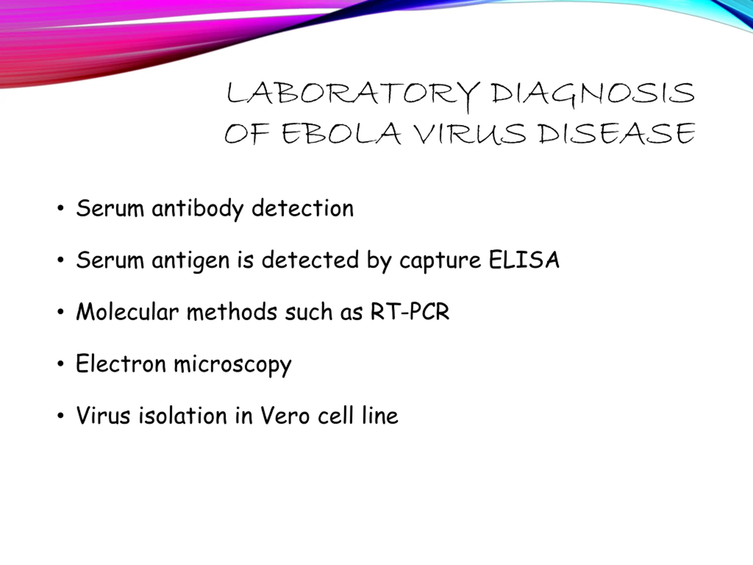 LABORATORY DIAGNOSIS OF EBOLA VIRUS DISEASE Serum antibody detection Serum antigen is detected by capture ELISA Molecular methods such as RT-PCR Electron microscopy Virus isolation in Vero cell line