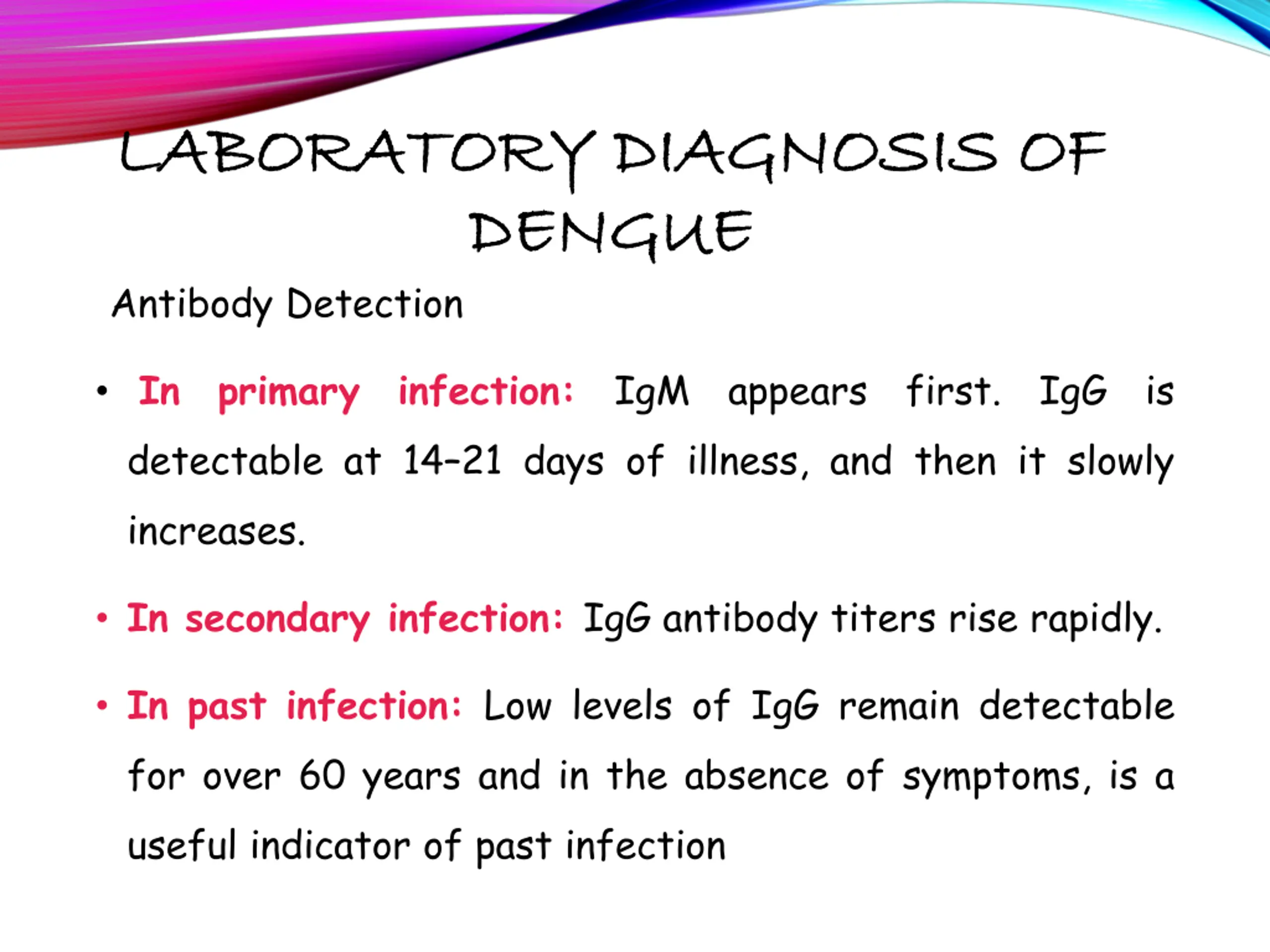 LABORATORY DIAGNOSIS OF LABORATORY DIAGNOSIS OF DENGUE DENGUE Antibody Detection In detectable at 14 21 days of illness, and then it slowly increases. primary infection: IgM appears first. IgG is In secondary infection: IgG antibody titers rise rapidly. In past infection: Low levels of IgG remain detectable for over 60 years and in the absence of symptoms, is a useful indicator of past infection