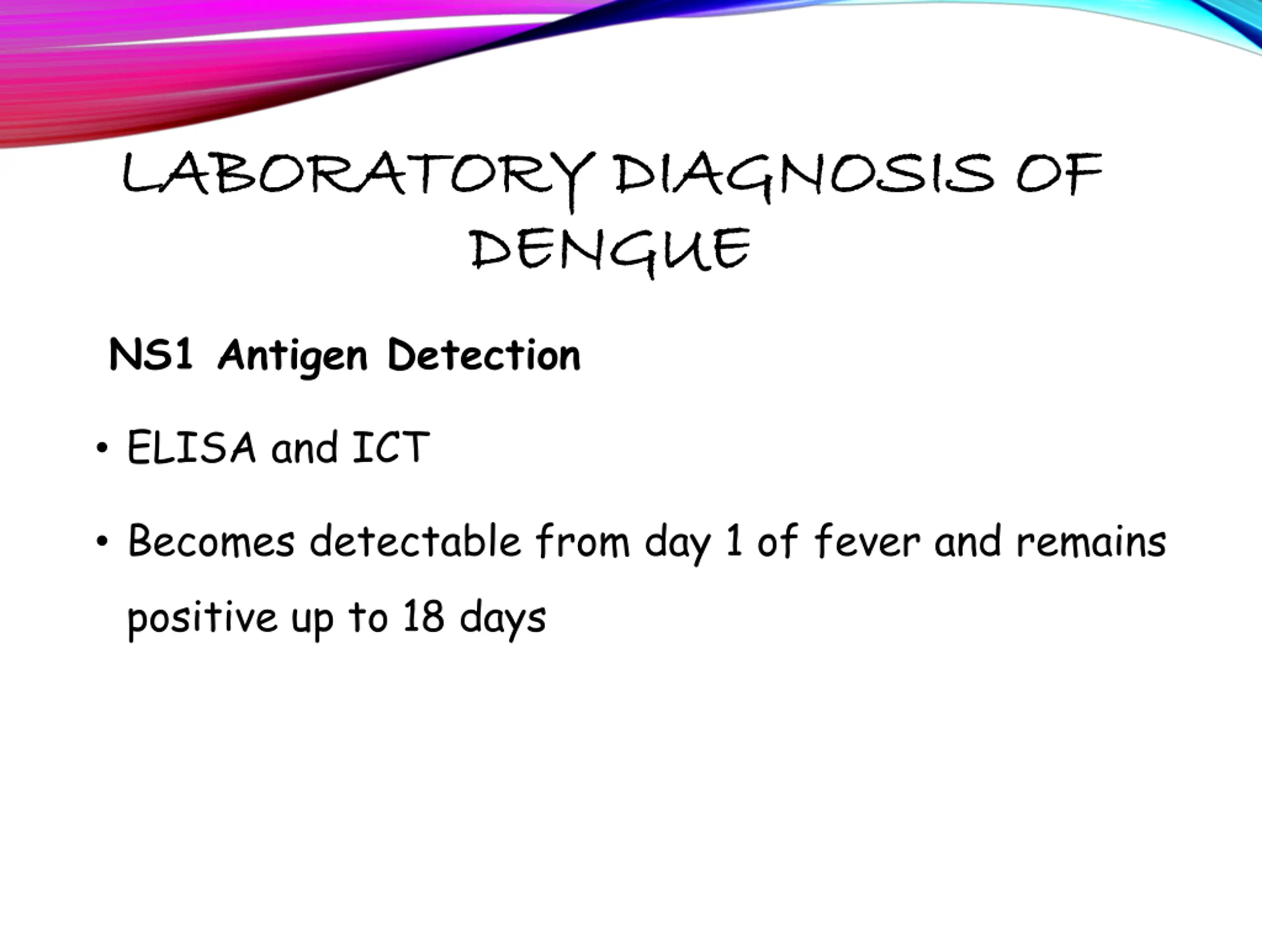 LABORATORY DIAGNOSIS OF LABORATORY DIAGNOSIS OF DENGUE DENGUE NS1 Antigen Detection ELISA and ICT Becomes detectable from day 1 of fever and remains positive up to 18 days