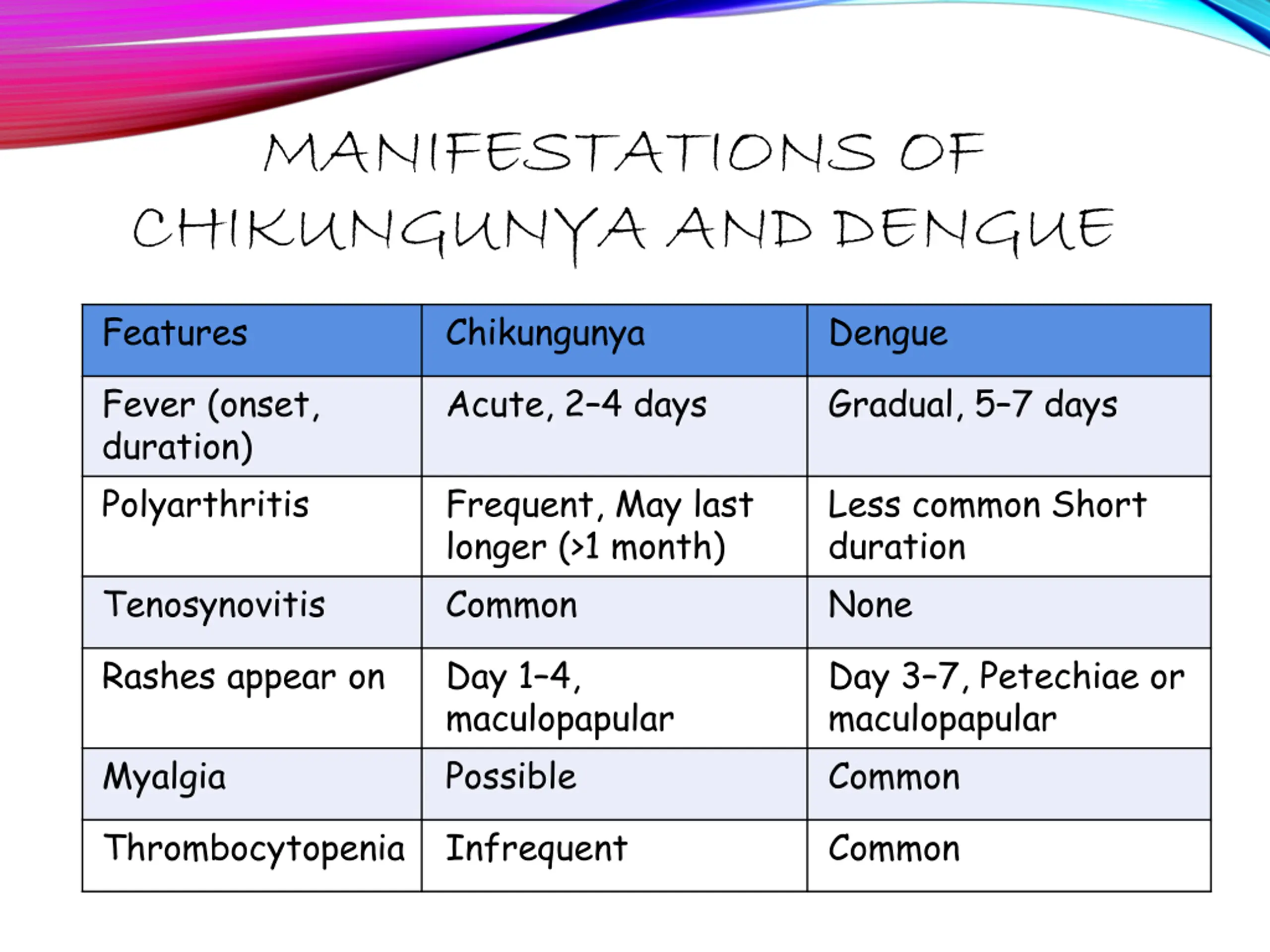 MANIFESTATIONS OF CHIKUNGUNYA AND DENGUE Features Chikungunya Dengue Fever (onset, duration) Polyarthritis Acute, 2 4 days Gradual, 5 7 days Frequent, May last longer (>1 month) Common Less common Short duration None Tenosynovitis Rashes appear on Day 1 4, maculopapular Possible Day 3 7, Petechiae or maculopapular Common Myalgia Thrombocytopenia Infrequent Common
