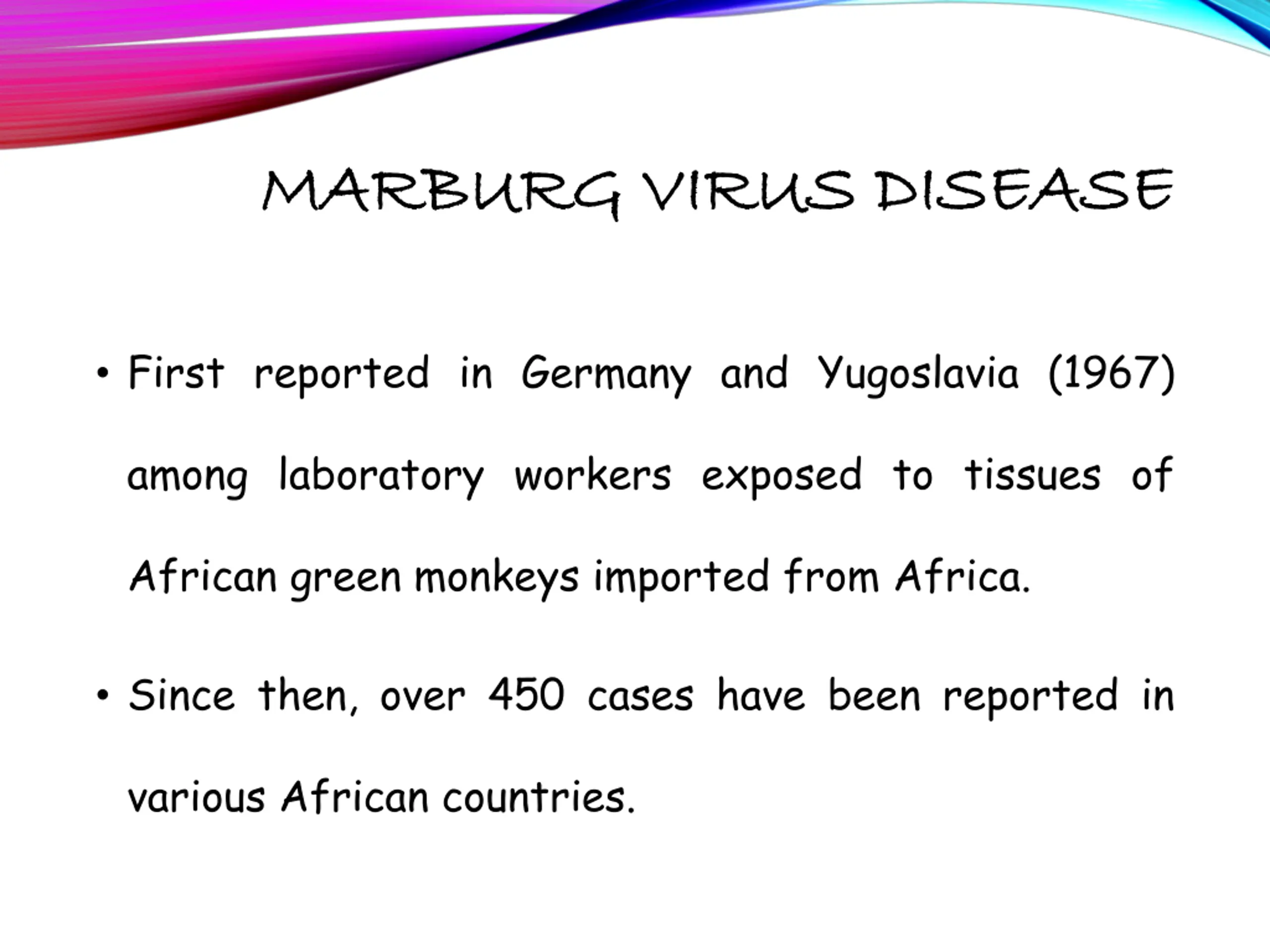MARBURG VIRUS DISEASE MARBURG VIRUS DISEASE First reported in Germany and Yugoslavia (1967) among laboratory workers exposed to tissues of African green monkeys imported from Africa. Since then, over 450 cases have been reported in various African countries.
