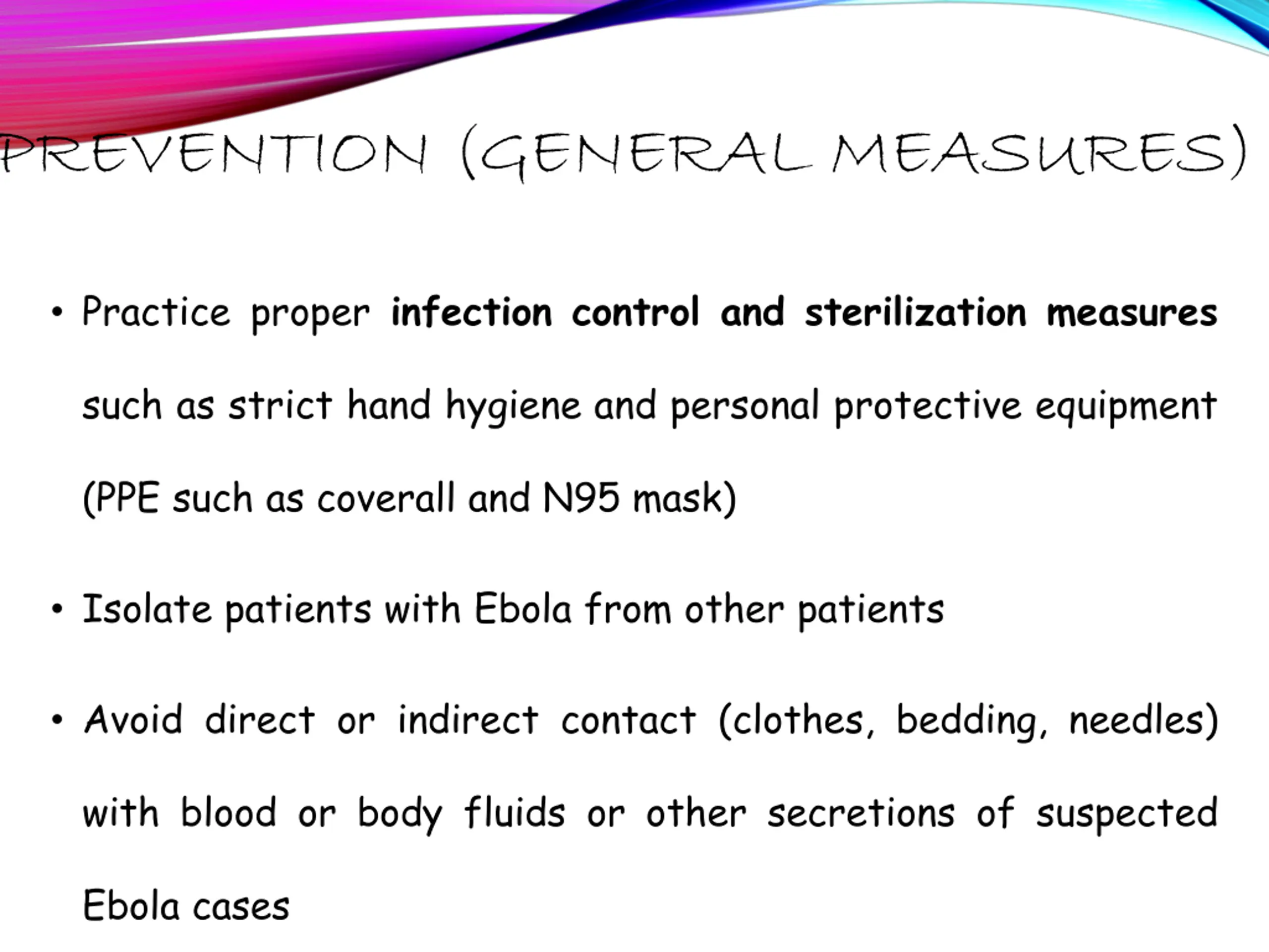 PREVENTION (GENERAL MEASURES) Practice proper infection control and sterilization measures such as strict hand hygiene and personal protective equipment (PPE such as coverall and N95 mask) Isolate patients with Ebola from other patients Avoid direct or indirect contact (clothes, bedding, needles) with blood or body fluids or other secretions of suspected Ebola cases