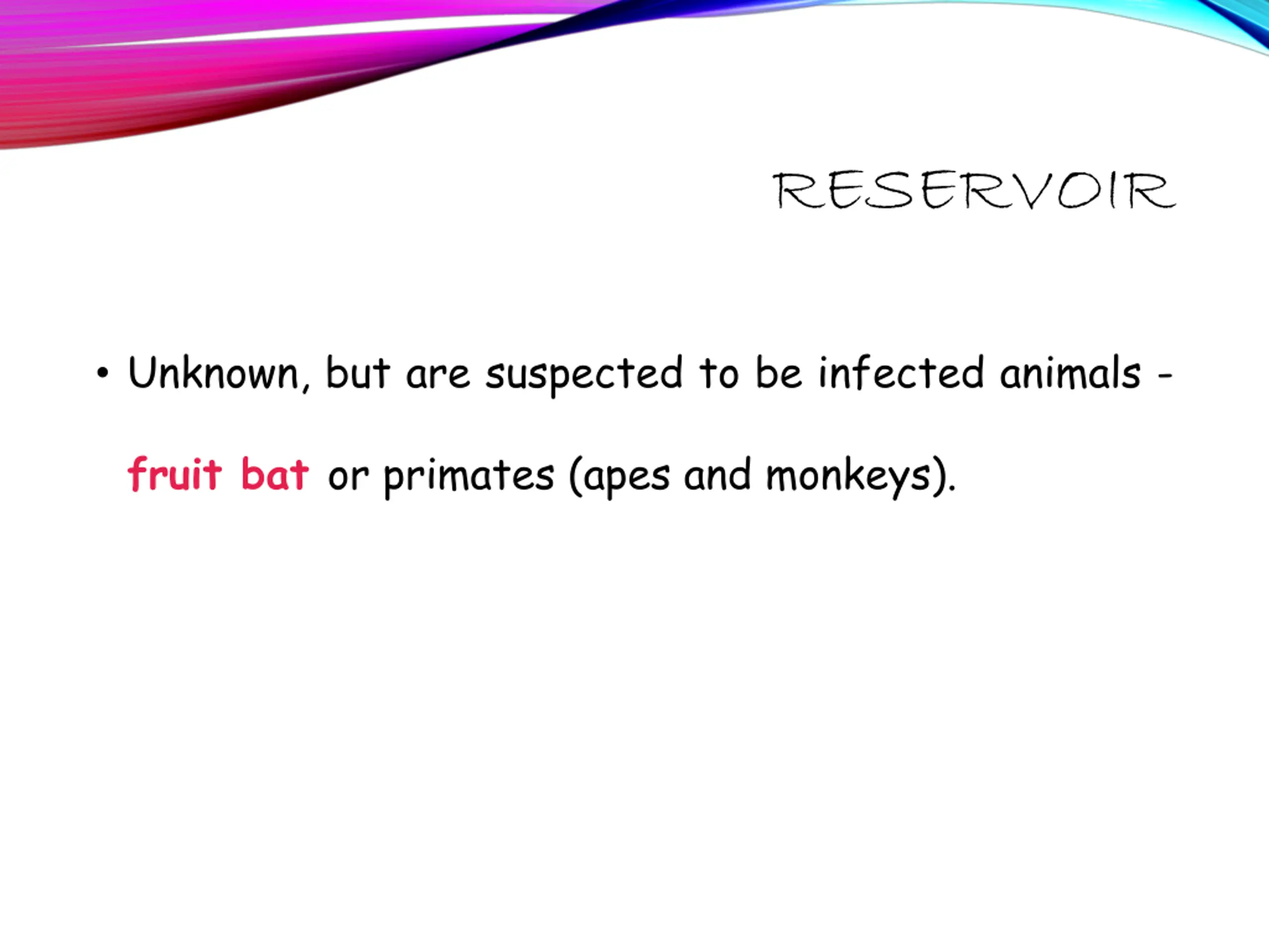 RESERVOIR Unknown, but are suspected to be infected animals - fruit bat or primates (apes and monkeys).