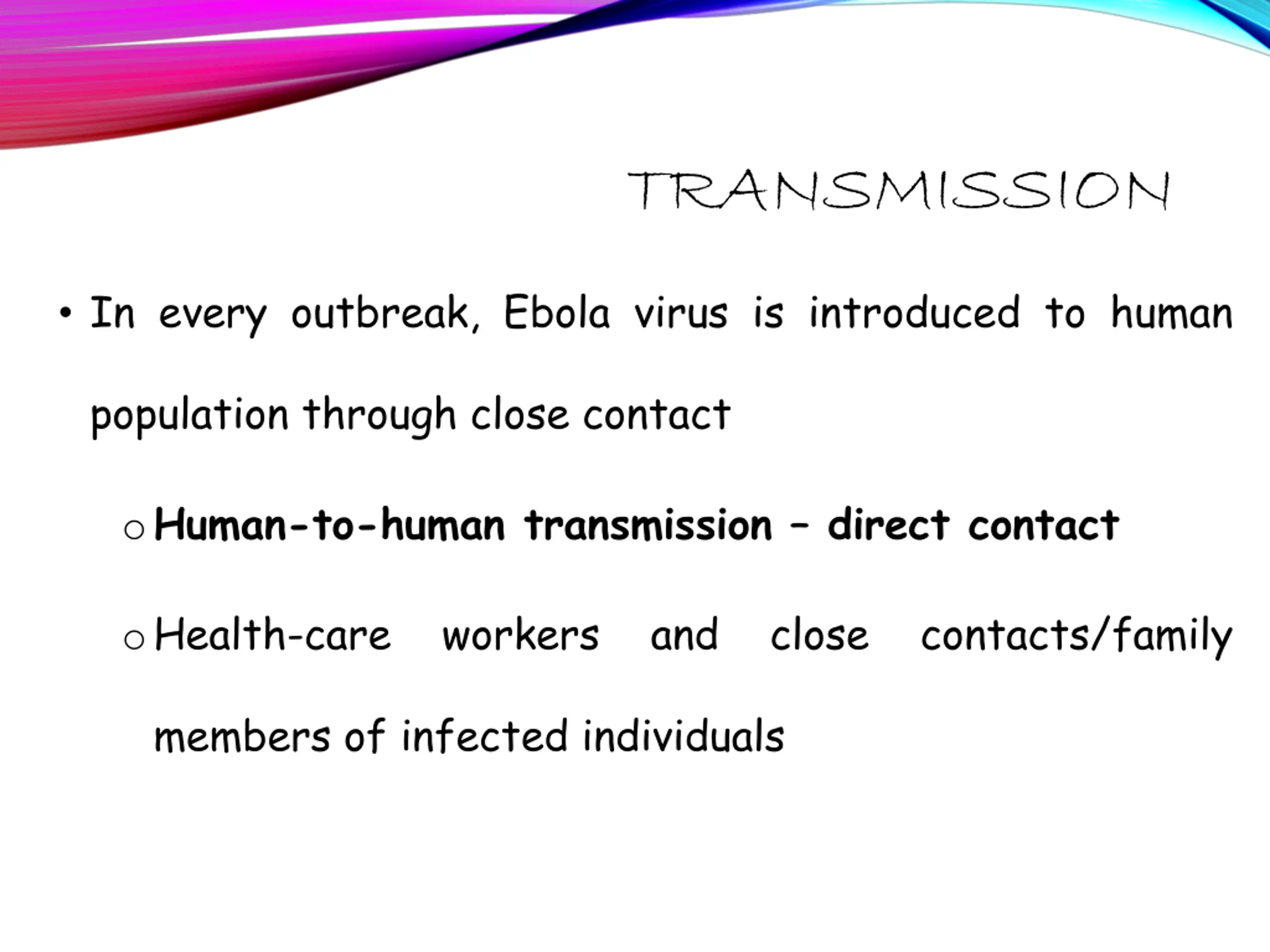 TRANSMISSION In every outbreak, Ebola virus is introduced to human population through close contact oHuman-to-human transmission direct contact oHealth-care workers and close contacts/family members of infected individuals