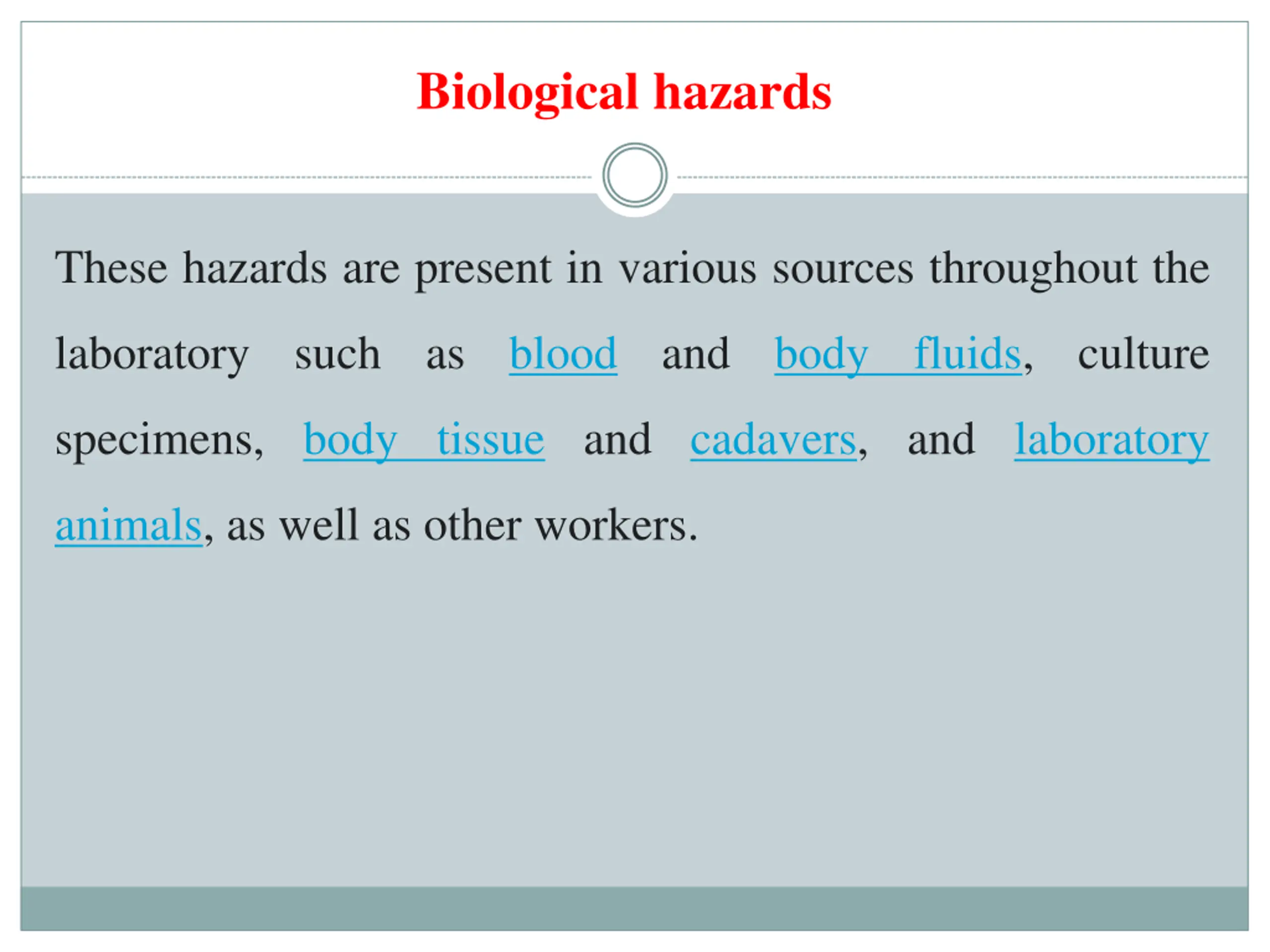 Biological hazards These hazards are present in various sources throughout the laboratory such as blood and body fluids, culture specimens, body tissue and cadavers, and laboratory animals, as well as other workers.