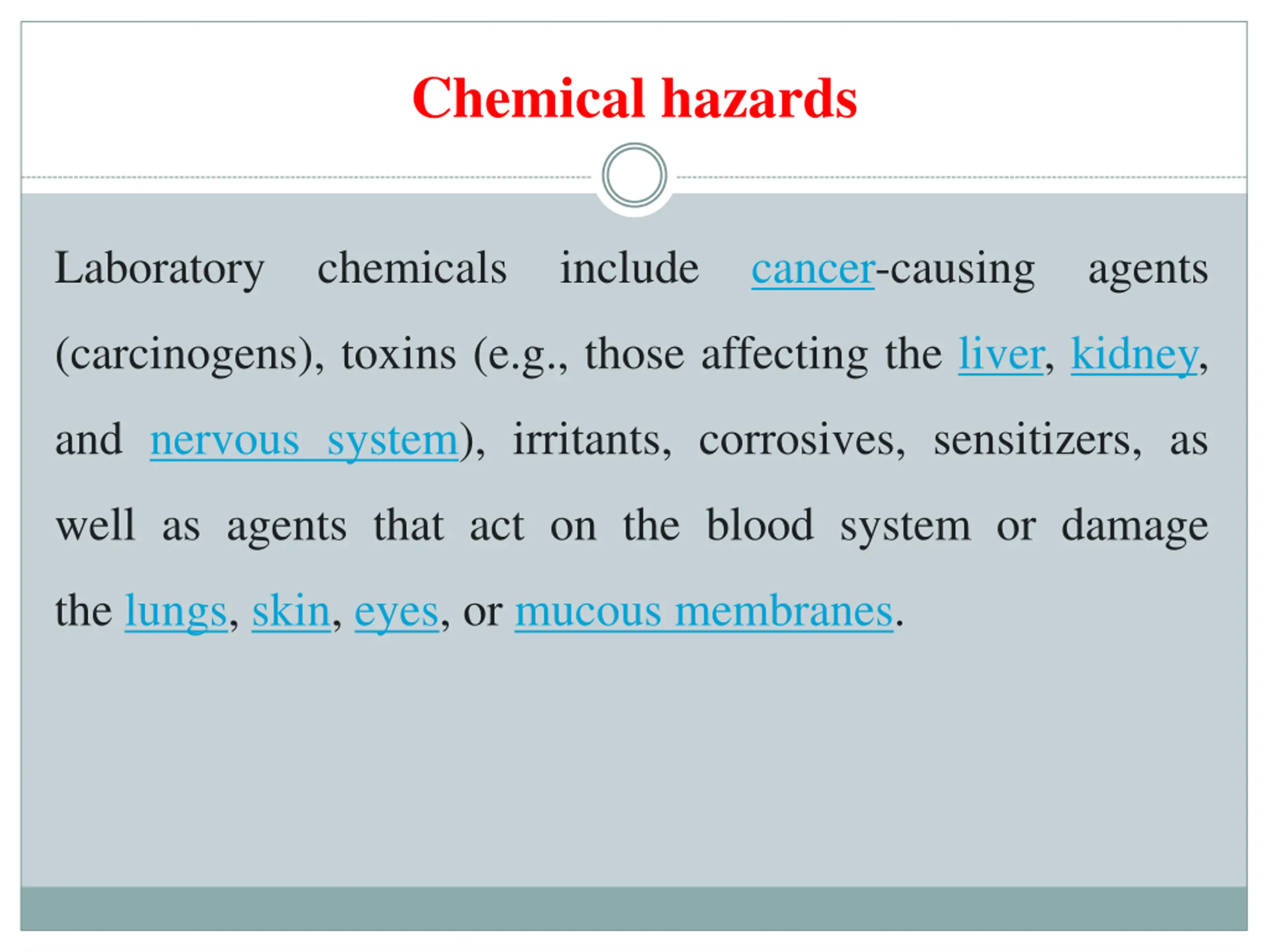 Chemical hazards Laboratory chemicals include cancer-causing agents (carcinogens), toxins (e.g., those affecting the liver, kidney, and nervous system), irritants, corrosives, sensitizers, as well as agents that act on the blood system or damage the lungs, skin, eyes, or mucous membranes.