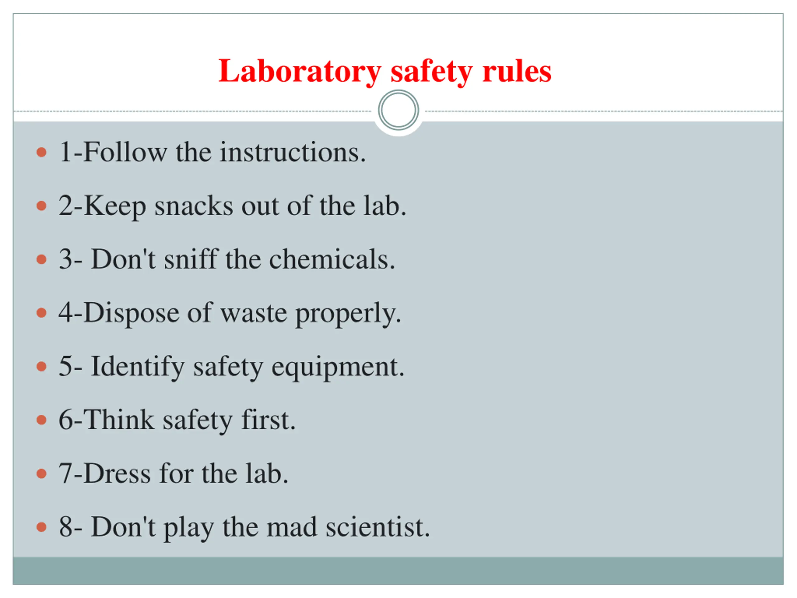 Laboratory safety rules 1-Follow the instructions. 2-Keep snacks out of the lab. 3- Don't sniff the chemicals. 4-Dispose of waste properly. 5- Identify safety equipment. 6-Think safety first. 7-Dress for the lab. 8- Don't play the mad scientist.