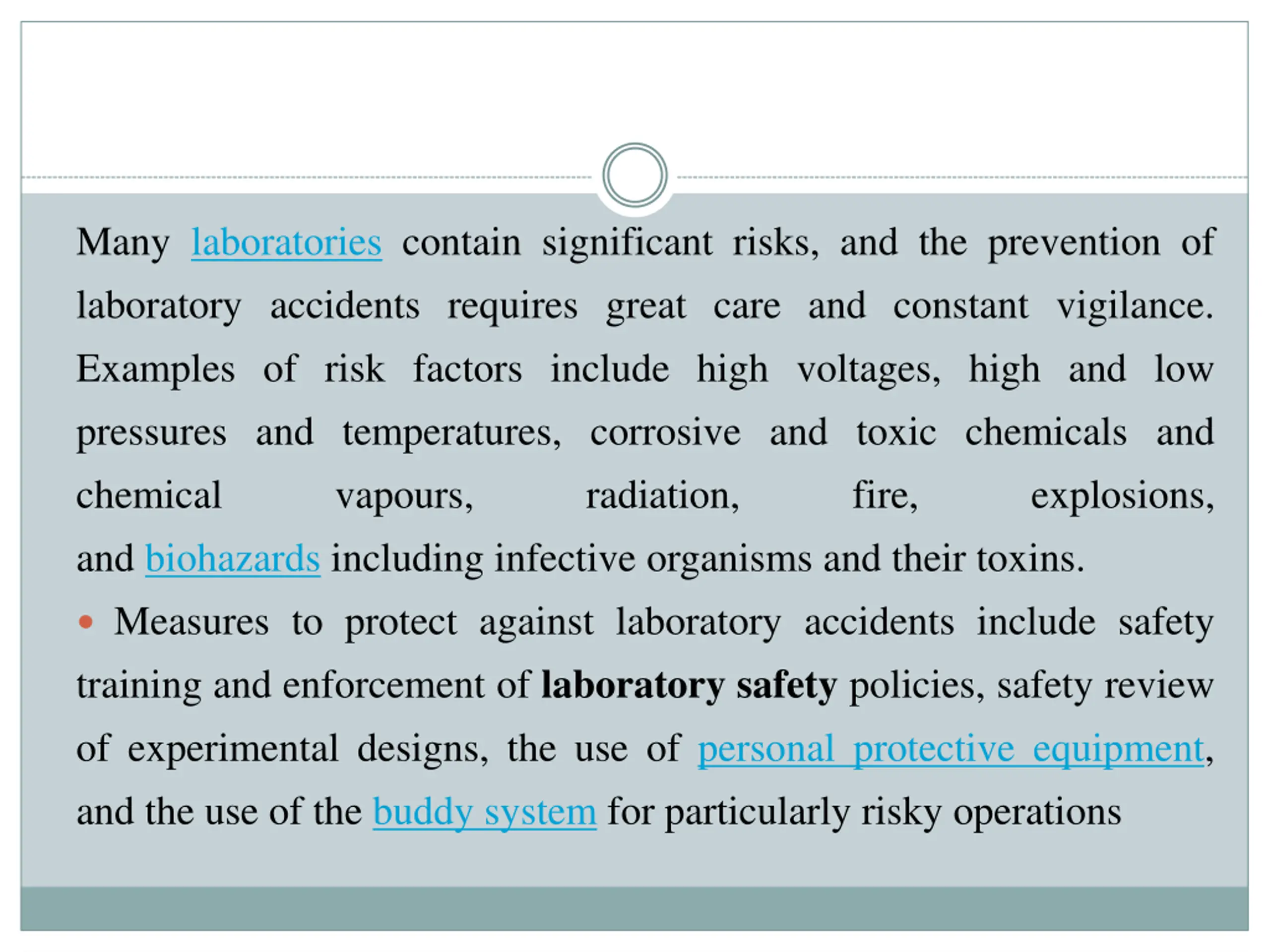 Many laboratories contain significant risks, and the prevention of laboratory accidents requires great care and constant vigilance. Examples of risk factors include high voltages, high and low pressures and temperatures, corrosive and toxic chemicals and chemical vapours, radiation, and biohazards including infective organisms and their toxins. Measures to protect against laboratory accidents include safety training and enforcement of laboratory safety policies, safety review of experimental designs, the use of personal protective equipment, and the use of the buddy system for particularly risky operations fire, explosions,