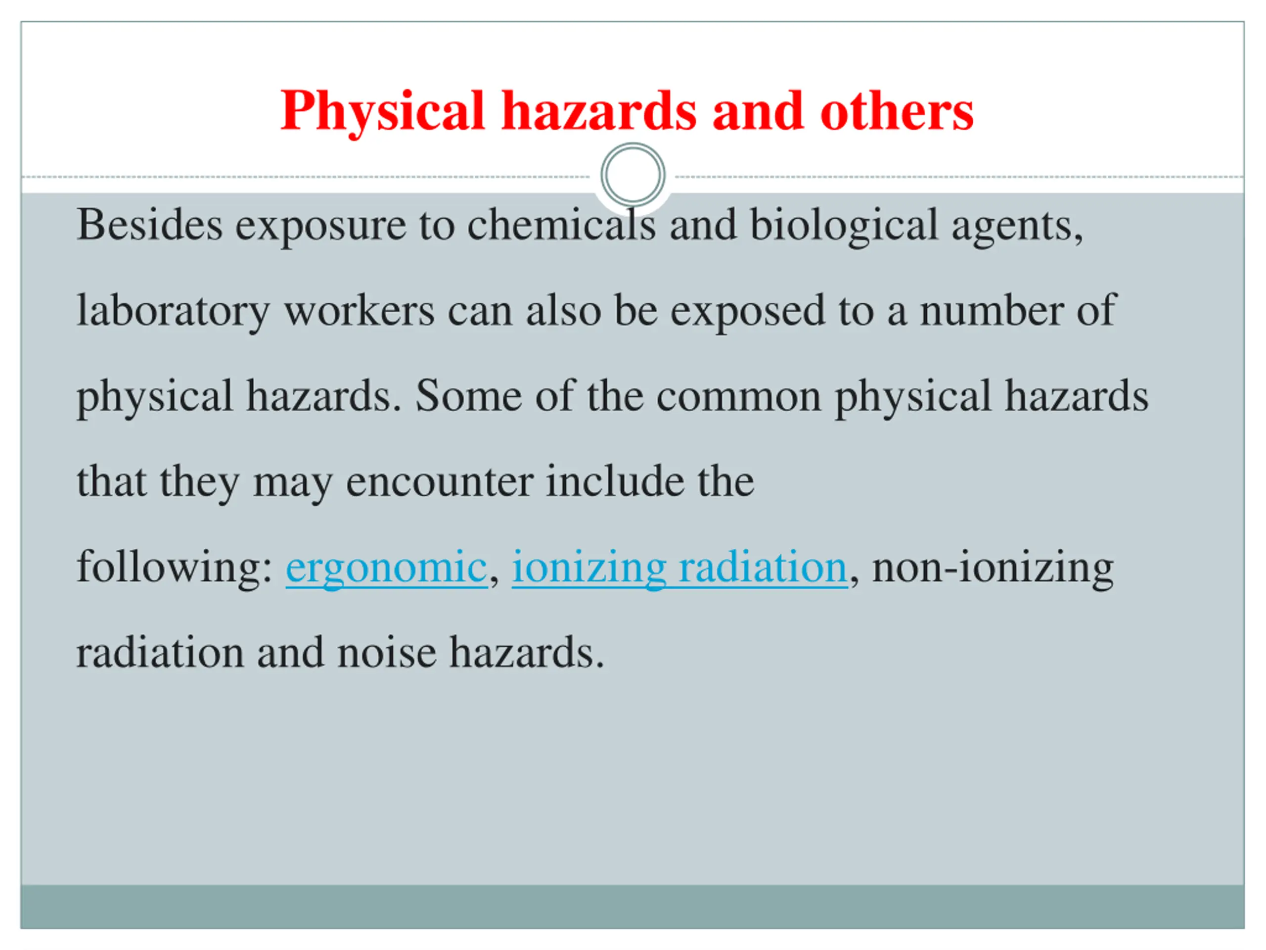 Physical hazards and others Besides exposure to chemicals and biological agents, laboratory workers can also be exposed to a number of physical hazards. Some of the common physical hazards that they may encounter include the following: ergonomic, ionizing radiation, non-ionizing radiation and noise hazards.