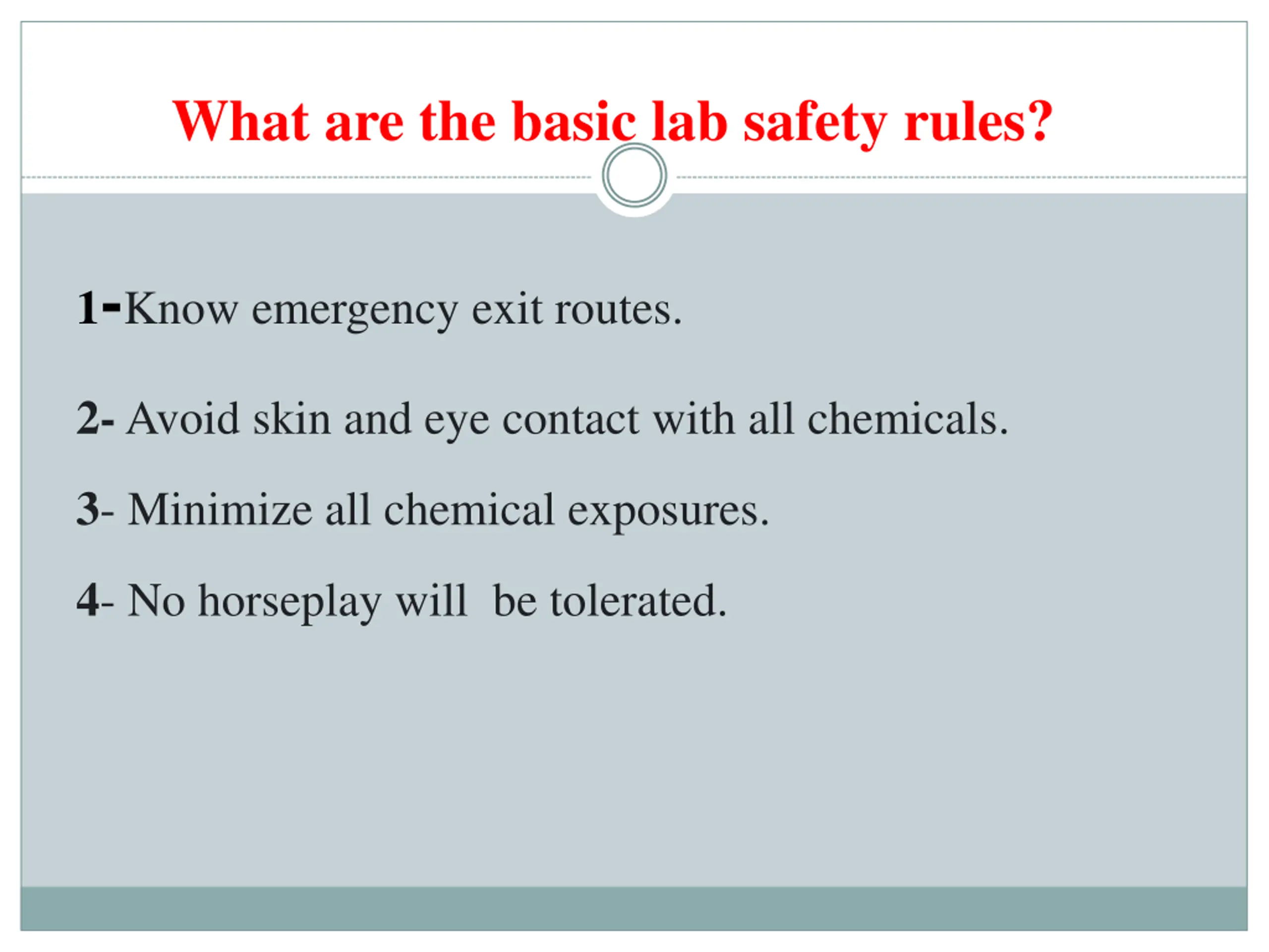 What are the basic lab safety rules? 1-Know emergency exit routes. 2-Avoid skin and eye contact with all chemicals. 3- Minimize all chemical exposures. 4- No horseplay will be tolerated.