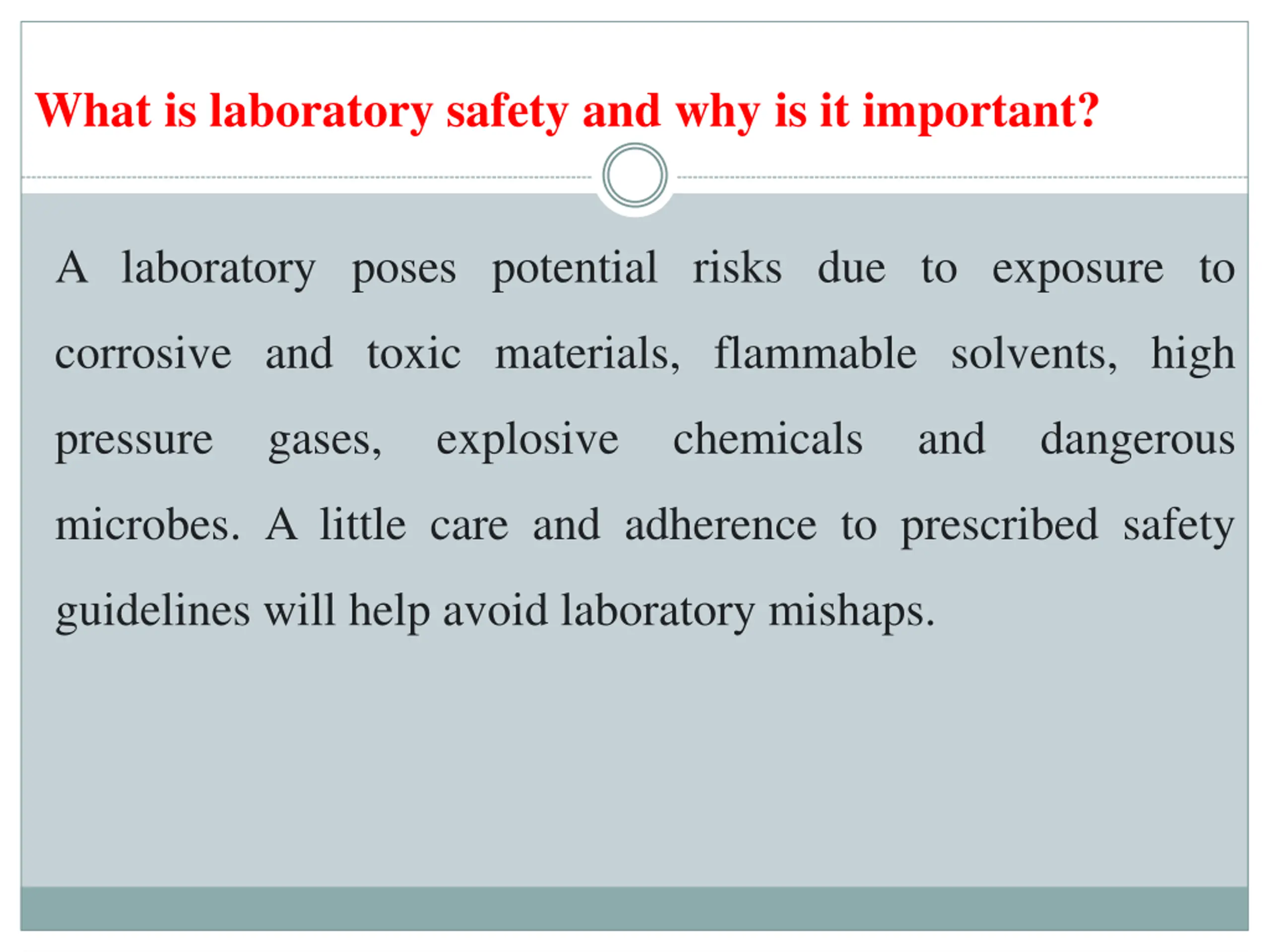 What is laboratory safety and why is it important? A laboratory poses potential risks due to exposure to corrosive and toxic materials, flammable solvents, high pressure gases, explosive chemicals and dangerous microbes. A little care and adherence to prescribed safety guidelines will help avoid laboratory mishaps.