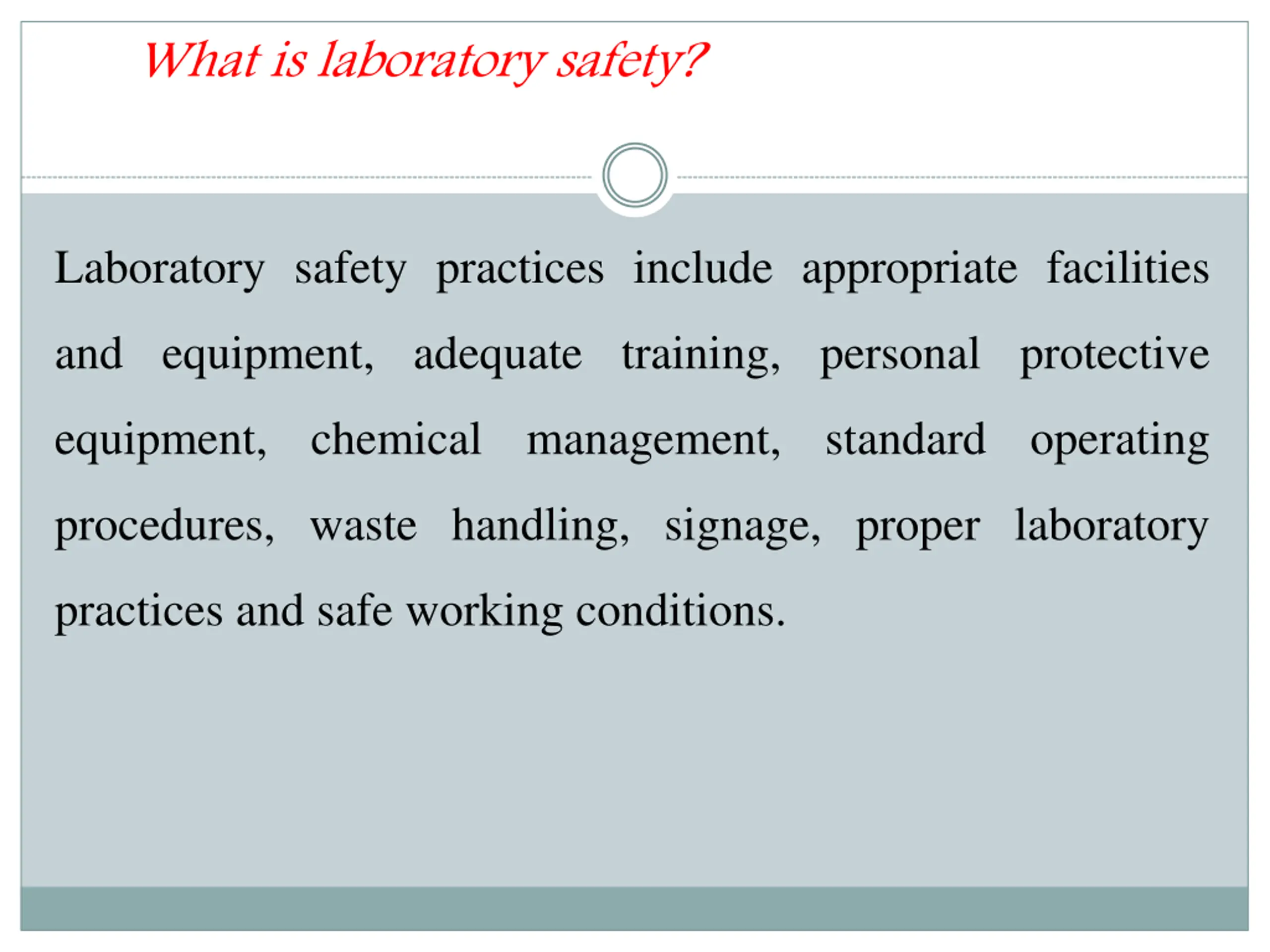 What is laboratory safety? Laboratory safety practices include appropriate facilities and equipment, adequate training, personal protective equipment, chemical management, standard operating procedures, waste handling, signage, proper laboratory practices and safe working conditions.
