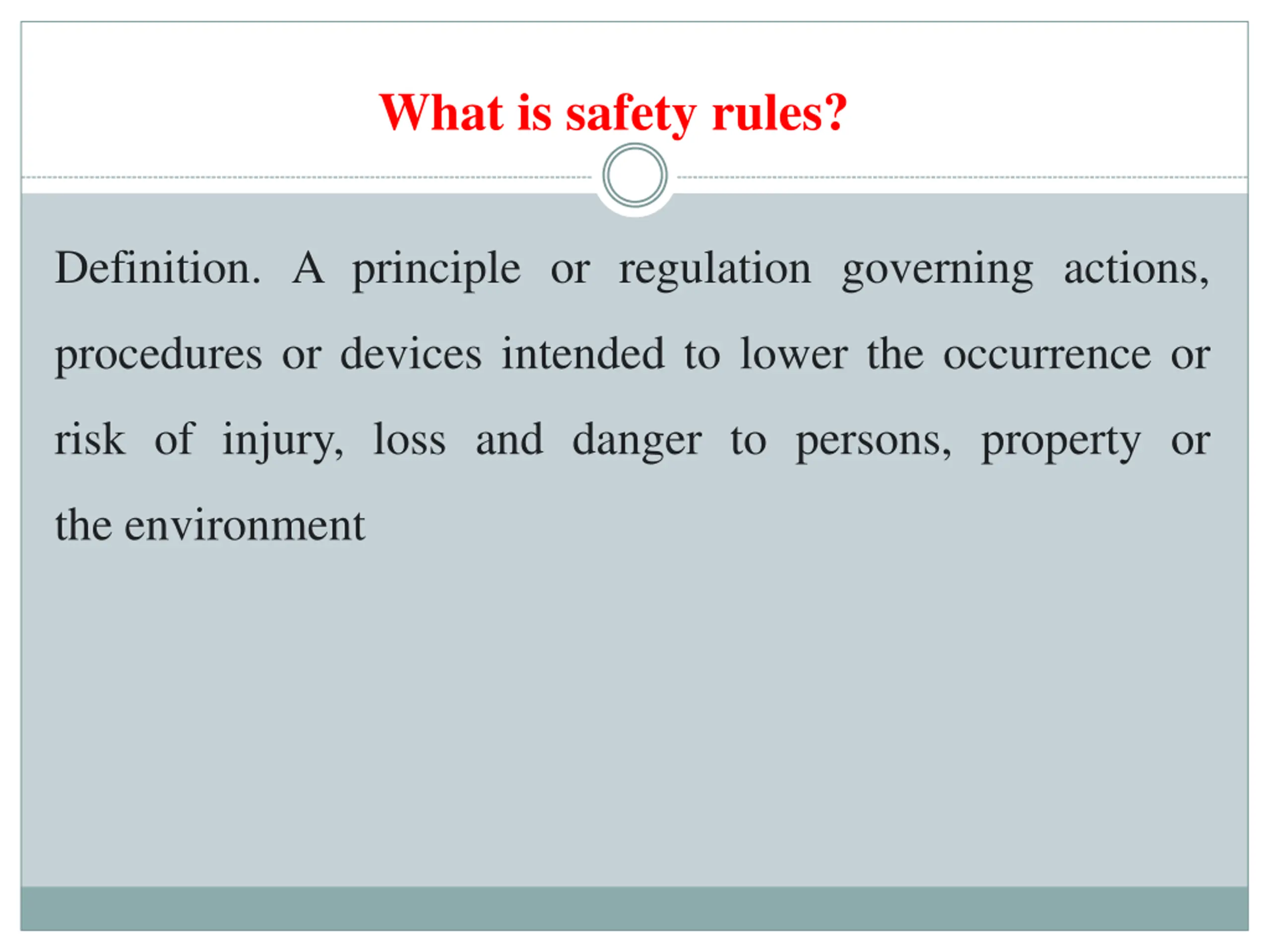 What is safety rules? Definition. A principle or regulation governing actions, procedures or devices intended to lower the occurrence or risk of injury, loss and danger to persons, property or the environment