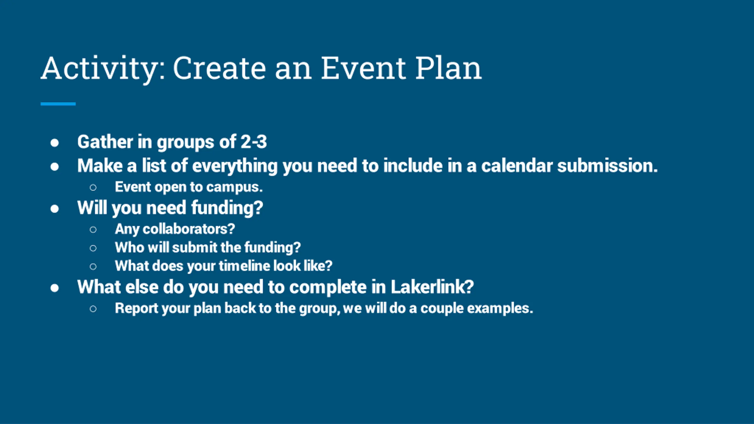 Activity: Create an Event Plan Gather in groups of 2-3 Make a list of everything you need to include in a calendar submission. Event open to campus. Will you need funding? Any collaborators? Who will submit the funding? What does your timeline look like? What else do you need to complete in Lakerlink? Report your plan back to the group, we will do a couple examples.