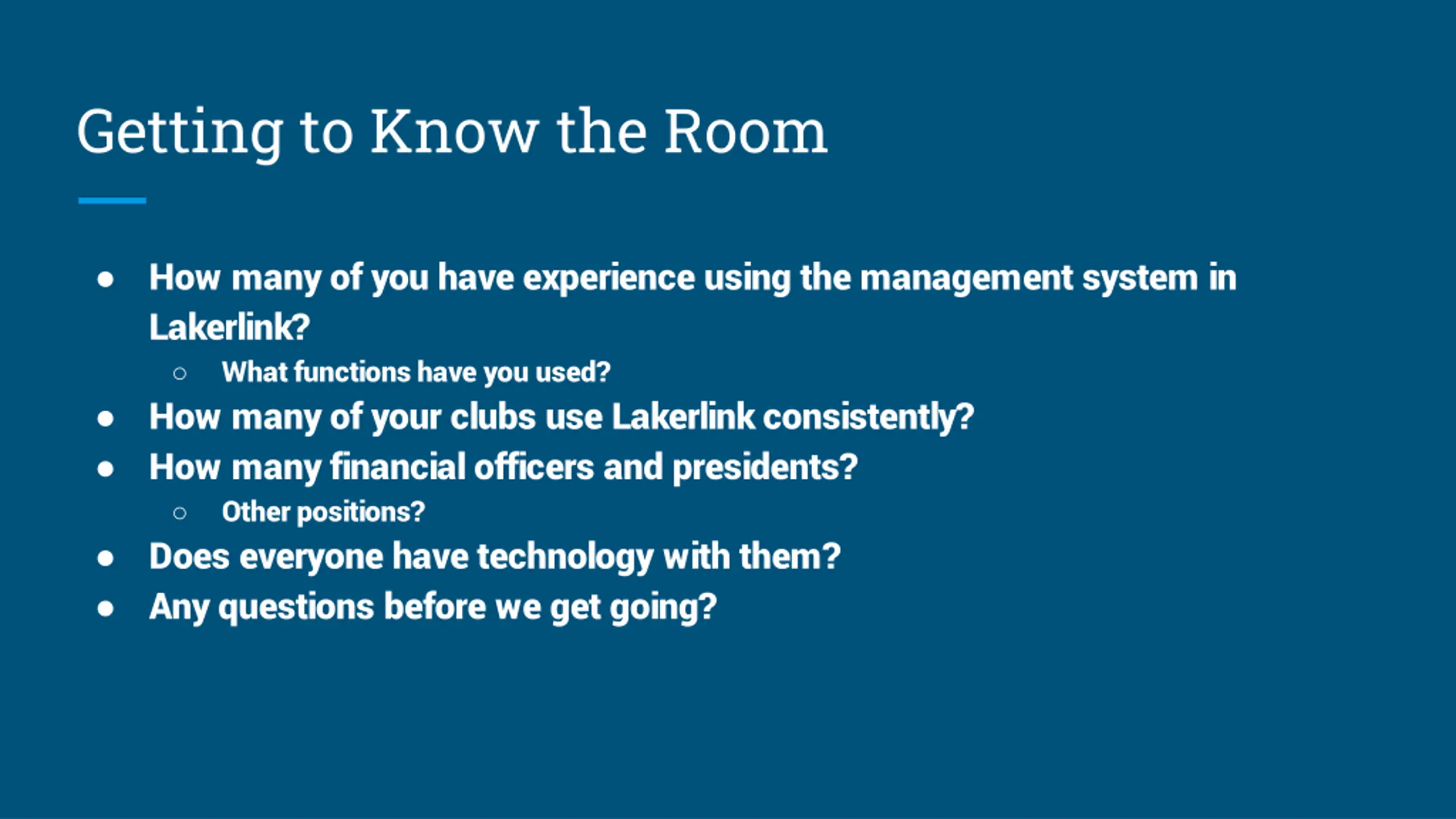 Getting to Know the Room How many of you have experience using the management system in Lakerlink? What functions have you used? How many of your clubs use Lakerlink consistently? How many financial officers and presidents? Other positions? Does everyone have technology with them? Any questions before we get going?