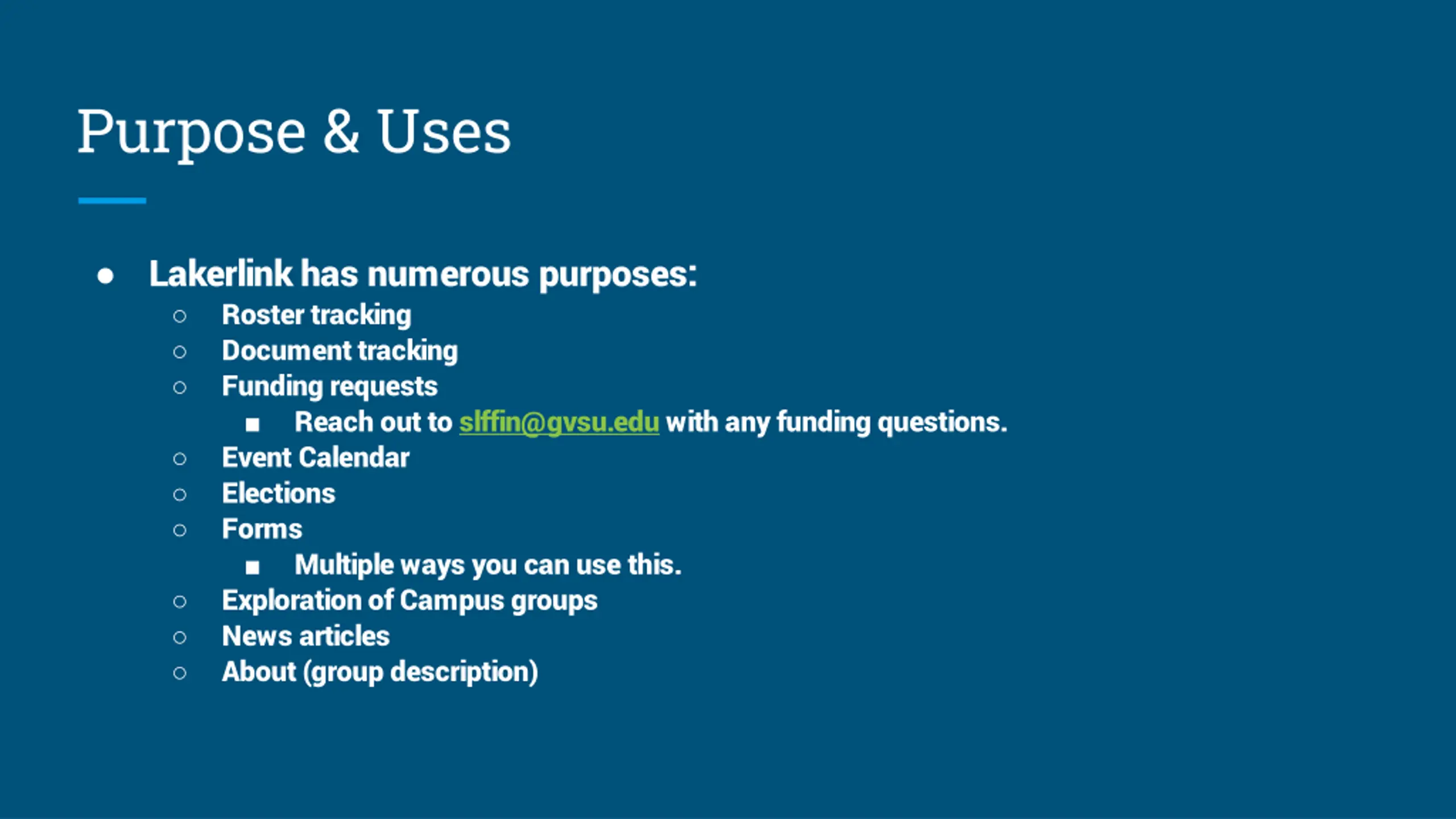 Purpose & Uses Lakerlink has numerous purposes: Roster tracking Document tracking Funding requests Reach out to slffin@gvsu.edu with any funding questions. Event Calendar Elections Forms Multiple ways you can use this. Exploration of Campus groups News articles About (group description)