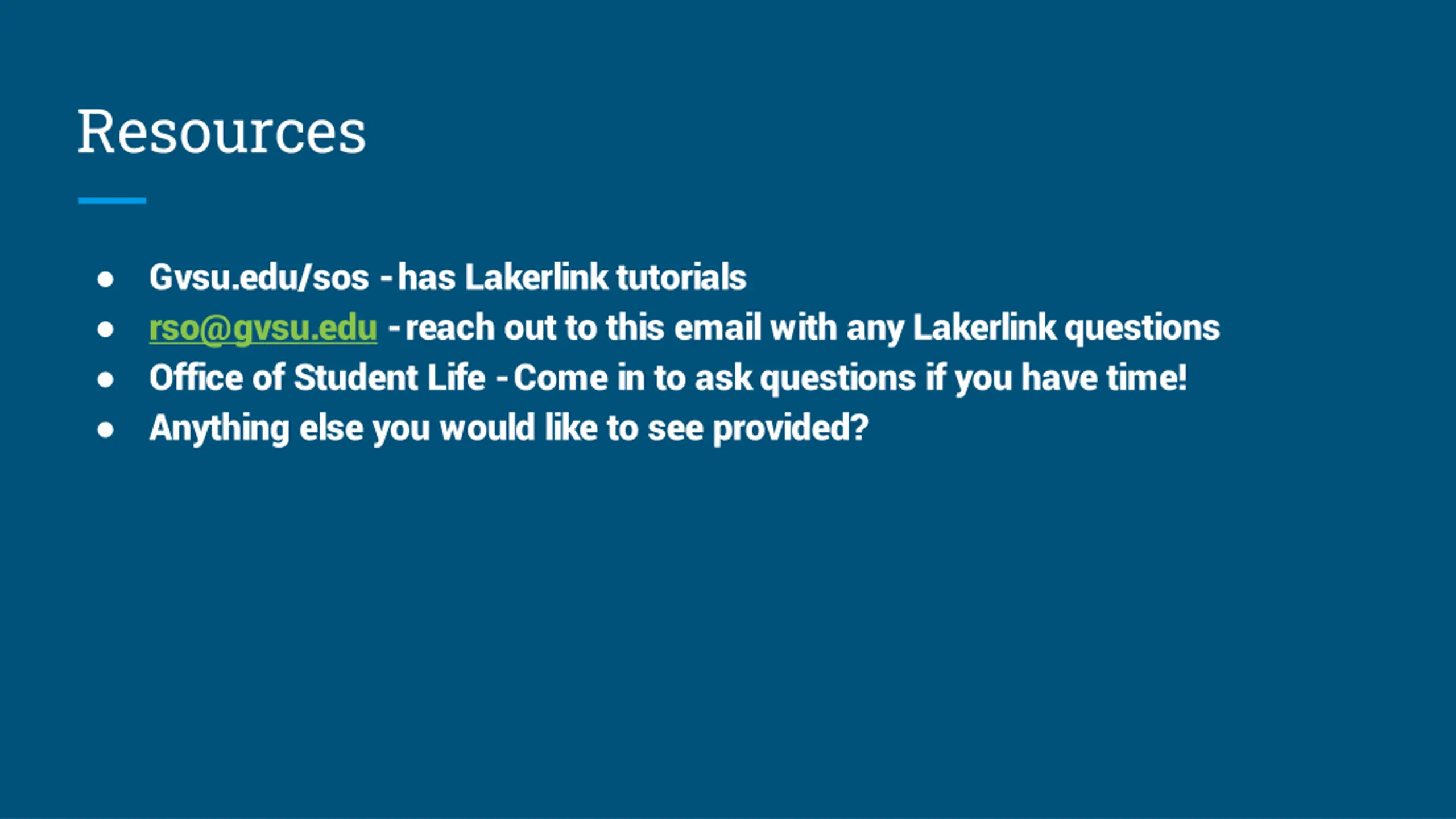 Resources Gvsu.edu/sos -has Lakerlink tutorials rso@gvsu.edu -reach out to this email with any Lakerlink questions Office of Student Life -Come in to ask questions if you have time! Anything else you would like to see provided?