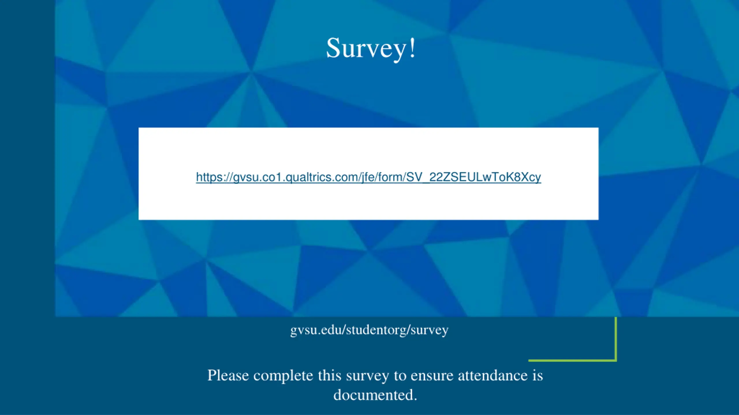 Survey! https://gvsu.co1.qualtrics.com/jfe/form/SV_22ZSEULwToK8Xcy gvsu.edu/studentorg/survey Please complete this survey to ensure attendance is documented.