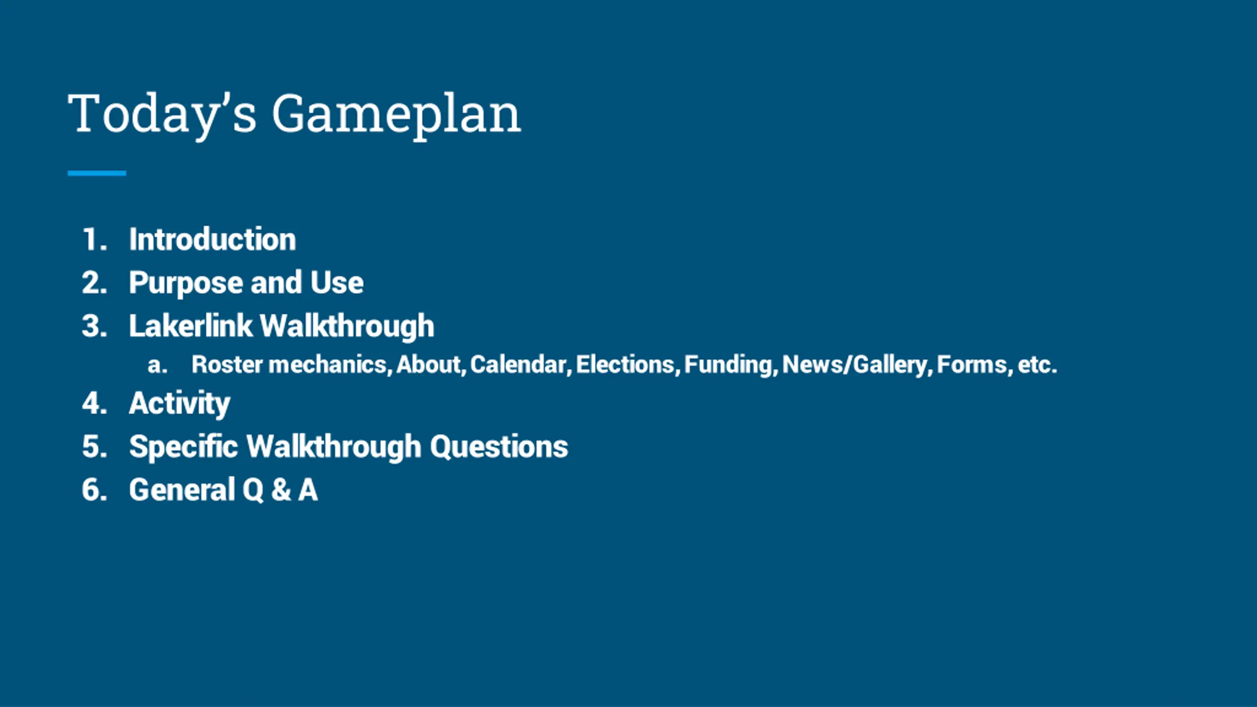 Todays Gameplan 1. Introduction 2. Purpose and Use 3. Lakerlink Walkthrough a. Roster mechanics, About, Calendar, Elections, Funding, News/Gallery, Forms, etc. 4. Activity 5. Specific Walkthrough Questions 6. General Q & A