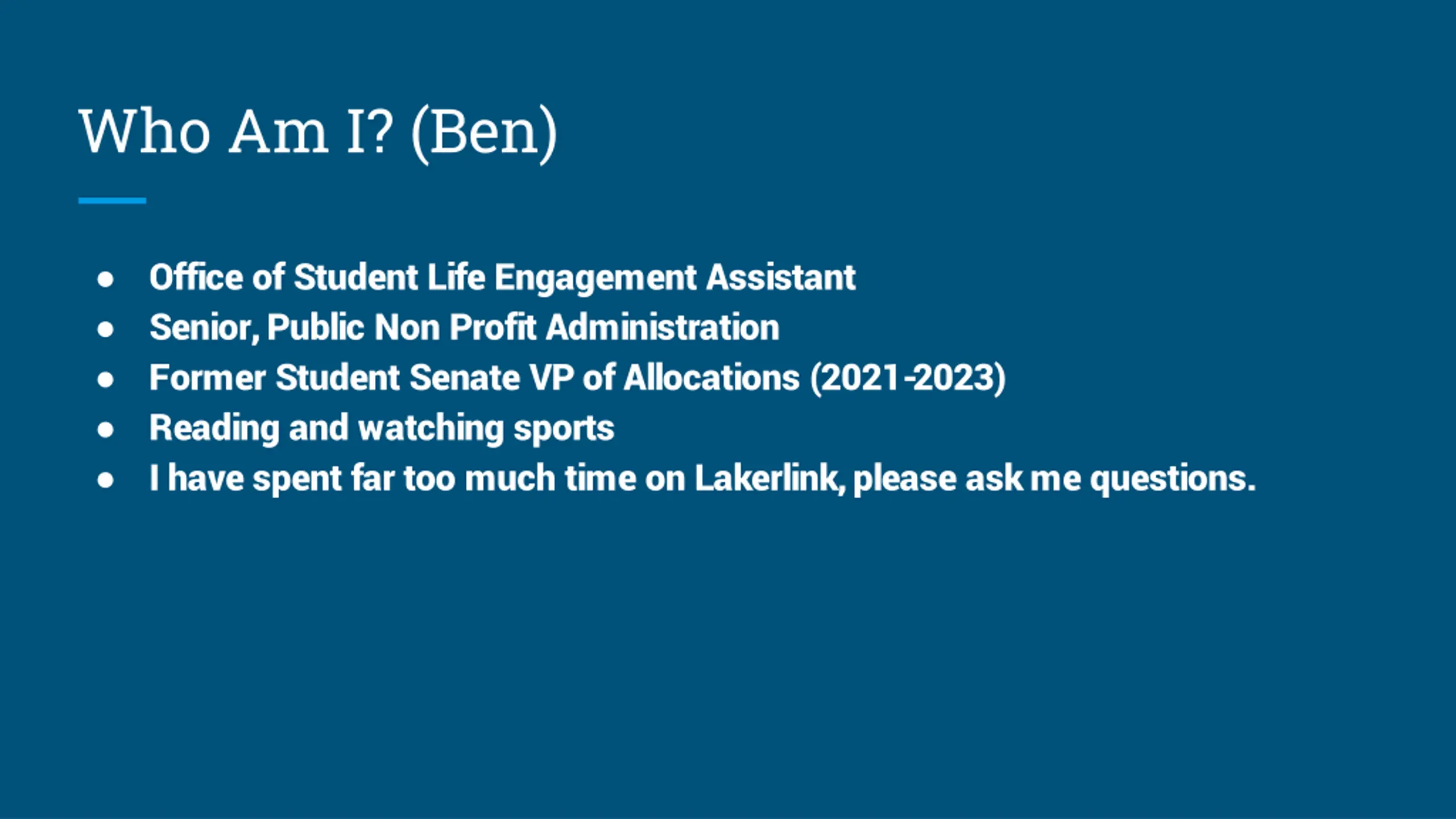 Who Am I? (Ben) Office of Student Life Engagement Assistant Senior, Public Non Profit Administration Former Student Senate VP of Allocations (2021-2023) Reading and watching sports I have spent far too much time on Lakerlink, please ask me questions.