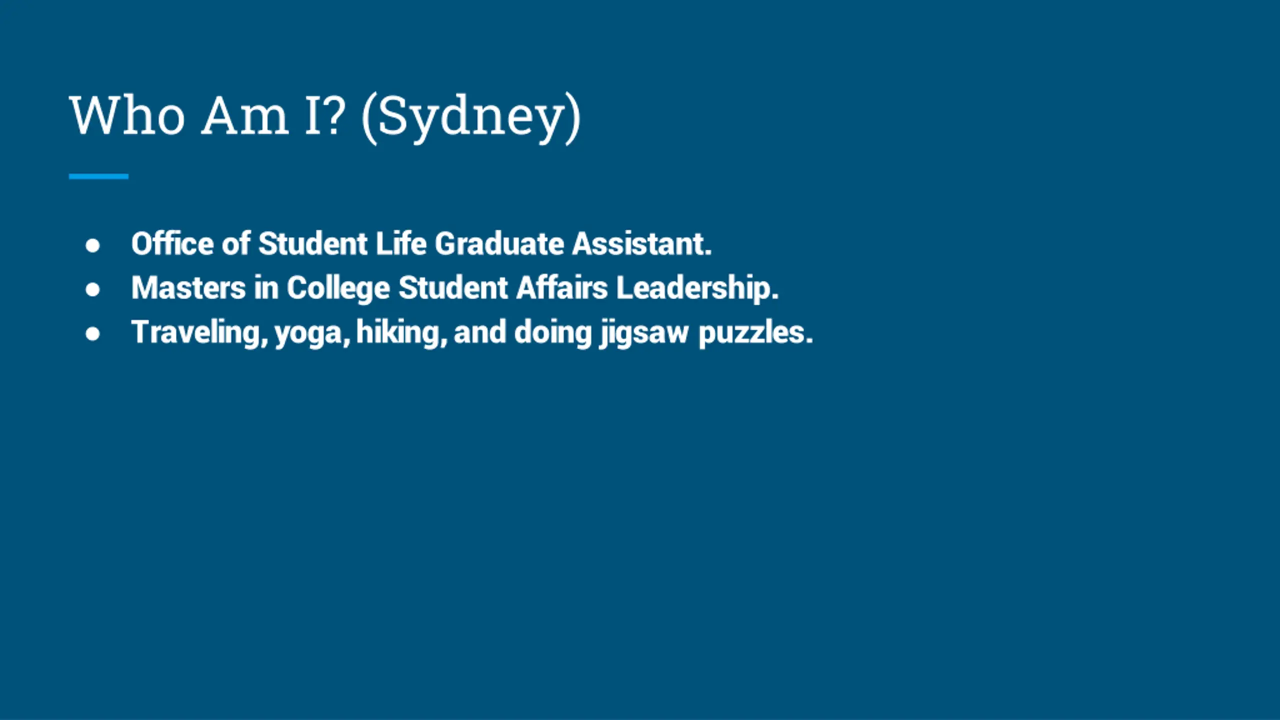 Who Am I? (Sydney) Office of Student Life Graduate Assistant. Masters in College Student Affairs Leadership. Traveling, yoga, hiking, and doing jigsaw puzzles.