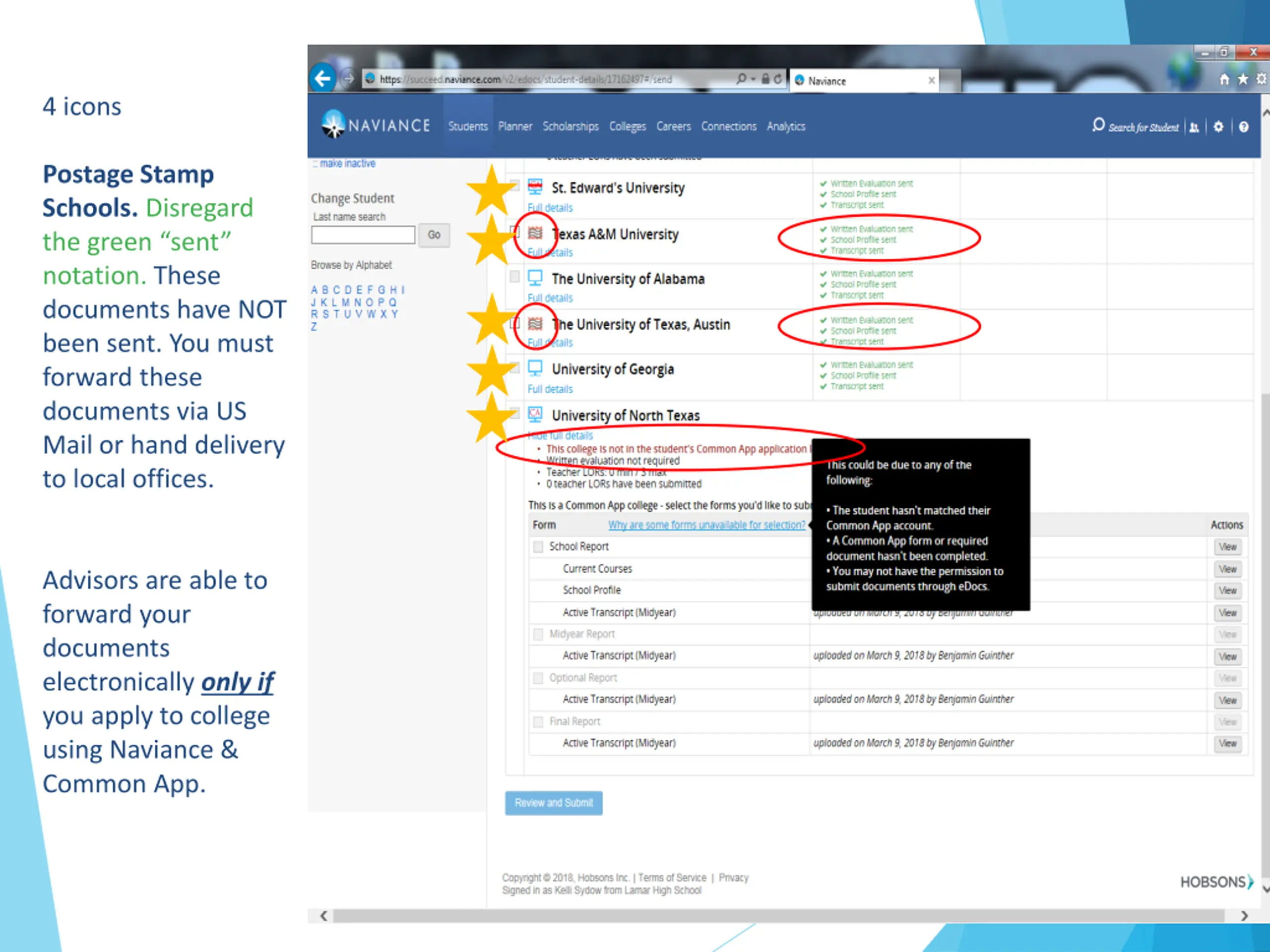 4 icons Postage Stamp Schools. Disregard the green sent notation. These documents have NOT been sent. You must forward these documents via US Mail or hand delivery to local offices. Advisors are able to forward your documents electronically only if you apply to college using Naviance & Common App.