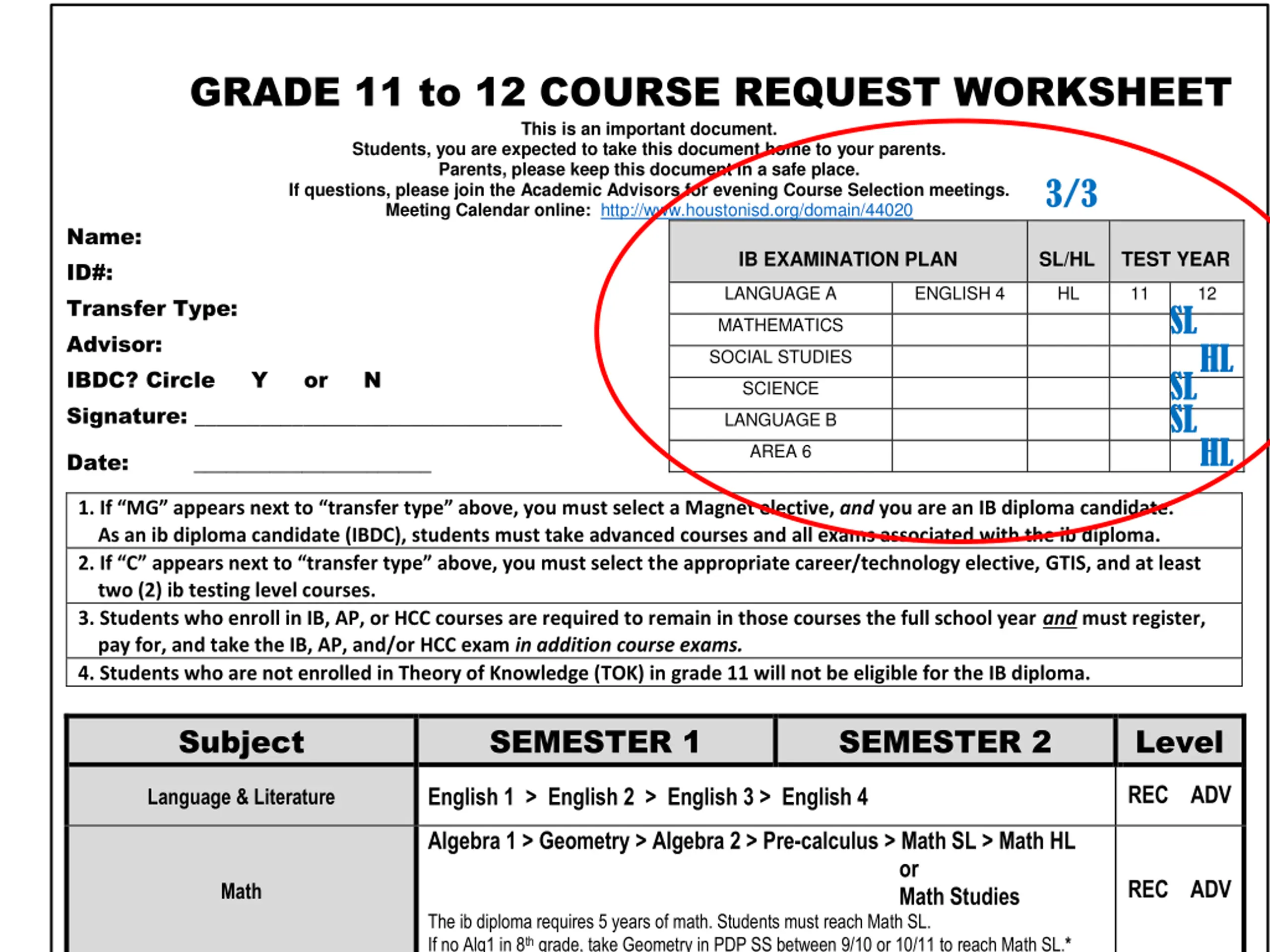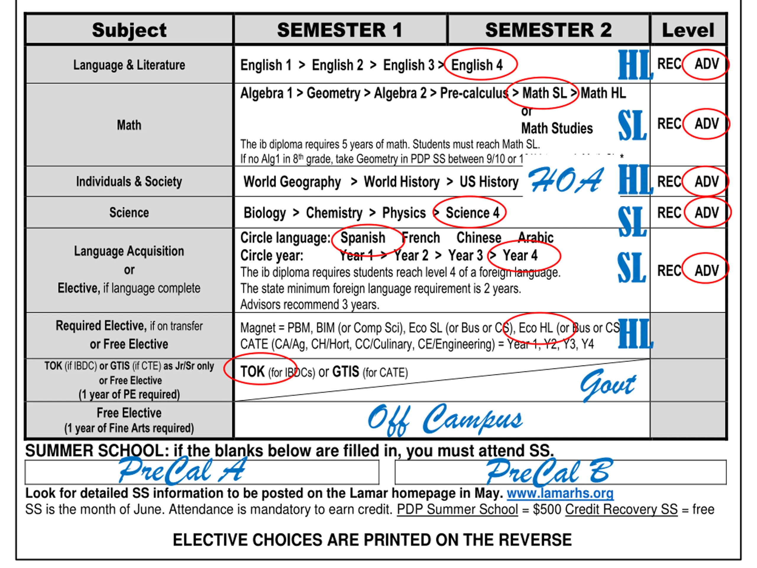 GRADE 11 to 12 COURSE REQUEST WORKSHEET This is an important document. Students, you are expected to take this document home to your parents. Parents, please keep this document in a safe place. If questions, please join the Academic Advisors for evening Course Selection meetings. Meeting Calendar online: http://www.houstonisd.org/domain/44020 Name: ID#: Transfer Type: Advisor: IBDC? Circle Y or N Signature: __________________________________ IB EXAMINATION PLAN SL/HL TEST YEAR LANGUAGE A ENGLISH 4 HL 11 12 7 7 7 7 7 7 42 MATHEMATICS SOCIAL STUDIES SCIENCE LANGUAGE B AREA 6 Date: ______________________ 1. If MG appears next to transfer type above, you must select a Magnet elective, and you are an IB diploma candidate. As an ib diploma candidate (IBDC), students must take advanced courses and all exams associated with the ib diploma. 2. If C appears next to transfer type above, you must select the appropriate career/technology elective, GTIS, and at least two (2) ib testing level courses. 3. Students who enroll in IB, AP, or HCC courses are required to remain in those courses the full school year and must register, pay for, and take the IB, AP, and/or HCC exam in addition course exams. 4. Students who are not enrolled in Theory of Knowledge (TOK) in grade 11 will not be eligible for the IB diploma. 24 Subject SEMESTER 1 SEMESTER 2 Level REC ADV English 1 > English 2 > English 3 > English 4 Language & Literature Algebra 1 > Geometry > Algebra 2 > Pre-calculus > Math SL > Math HL or Math Studies The ib diploma requires 5 years of math. Students must reach Math SL. If no Alg1 in 8th grade, take Geometry in PDP SS between 9/10 or 10/11 to reach Math SL.* World Geography > World History > US History > Govt / Eco REC ADV Math REC ADV Individuals & Society Biology > Chemistry > Physics > Science 4 Circle language: Spanish French Chinese Arabic Circle year: Year 1 > Year 2 > Year 3 > Year 4 The ib diploma requires students reach level 4 of a foreign language. The state minimum foreign language requirement is 2 years. Advisors recommend 3 years. REC ADV Science Language Acquisition or Elective, if language complete REC ADV Required Elective, if on transfer or Free Elective Magnet = PBM, BIM (or Comp Sci), Eco SL (or Bus or CS), Eco HL (or Bus or CS) CATE (CA/Ag, CH/Hort, CC/Culinary, CE/Engineering) = Year 1, Y2, Y3, Y4 TOK (if IBDC) or GTIS (if CTE) as Jr/Sr only or Free Elective (1 year of PE required) Free Elective (1 year of Fine Arts required) SUMMER SCHOOL: if the blanks below are filled in, you must attend SS. Look for detailed SS information to be posted on the Lamar homepage in May. www.lamarhs.org SS is the month of June. Attendance is mandatory to earn credit. PDP Summer School = $500 Credit Recovery SS = free TOK(for IBDCs) or GTIS(for CATE) ELECTIVE CHOICES ARE PRINTED ON THE REVERSE