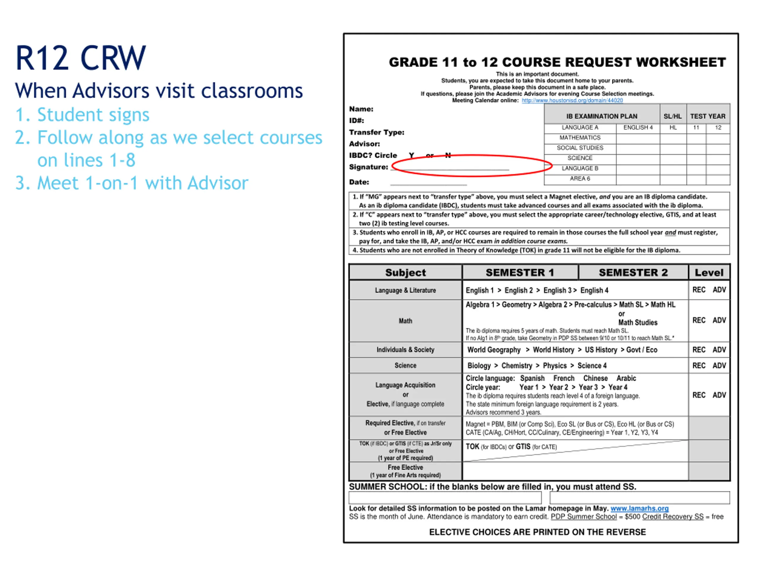 R12 CRW When Advisors visit classrooms 1. Student signs 2. Follow along as we select courses on lines 1-8 3. Meet 1-on-1 with Advisor GRADE 11 to 12 COURSE REQUEST WORKSHEET This is an important document. Students, you are expected to take this document home to your parents. Parents, please keep this document in a safe place. If questions, please join the Academic Advisors for evening Course Selection meetings. Meeting Calendar online: http://www.houstonisd.org/domain/44020 Name: ID#: Transfer Type: Advisor: IBDC? Circle Y or N Signature: __________________________________ IB EXAMINATION PLAN SL/HL TEST YEAR LANGUAGE A ENGLISH 4 HL 11 12 MATHEMATICS SOCIAL STUDIES SCIENCE LANGUAGE B AREA 6 Date: ______________________ 1. If MG appears next to transfer type above, you must select a Magnet elective, and you are an IB diploma candidate. As an ib diploma candidate (IBDC), students must take advanced courses and all exams associated with the ib diploma. 2. If C appears next to transfer type above, you must select the appropriate career/technology elective, GTIS, and at least two (2) ib testing level courses. 3. Students who enroll in IB, AP, or HCC courses are required to remain in those courses the full school year and must register, pay for, and take the IB, AP, and/or HCC exam in addition course exams. 4. Students who are not enrolled in Theory of Knowledge (TOK) in grade 11 will not be eligible for the IB diploma. Subject SEMESTER 1 SEMESTER 2 Level REC ADV English 1 > English 2 > English 3 > English 4 Language & Literature Algebra 1 > Geometry > Algebra 2 > Pre-calculus > Math SL > Math HL or Math Studies The ib diploma requires 5 years of math. Students must reach Math SL. If no Alg1 in 8th grade, take Geometry in PDP SS between 9/10 or 10/11 to reach Math SL.* World Geography > World History > US History > Govt / Eco REC ADV Math REC ADV Individuals & Society Biology > Chemistry > Physics > Science 4 Circle language: Spanish French Chinese Arabic Circle year: Year 1 > Year 2 > Year 3 > Year 4 The ib diploma requires students reach level 4 of a foreign language. The state minimum foreign language requirement is 2 years. Advisors recommend 3 years. REC ADV Science Language Acquisition or Elective, if language complete REC ADV Required Elective, if on transfer or Free Elective Magnet = PBM, BIM (or Comp Sci), Eco SL (or Bus or CS), Eco HL (or Bus or CS) CATE (CA/Ag, CH/Hort, CC/Culinary, CE/Engineering) = Year 1, Y2, Y3, Y4 TOK (if IBDC) or GTIS (if CTE) as Jr/Sr only or Free Elective (1 year of PE required) Free Elective (1 year of Fine Arts required) SUMMER SCHOOL: if the blanks below are filled in, you must attend SS. Look for detailed SS information to be posted on the Lamar homepage in May. www.lamarhs.org SS is the month of June. Attendance is mandatory to earn credit. PDP Summer School = $500 Credit Recovery SS = free TOK(for IBDCs) or GTIS(for CATE) ELECTIVE CHOICES ARE PRINTED ON THE REVERSE