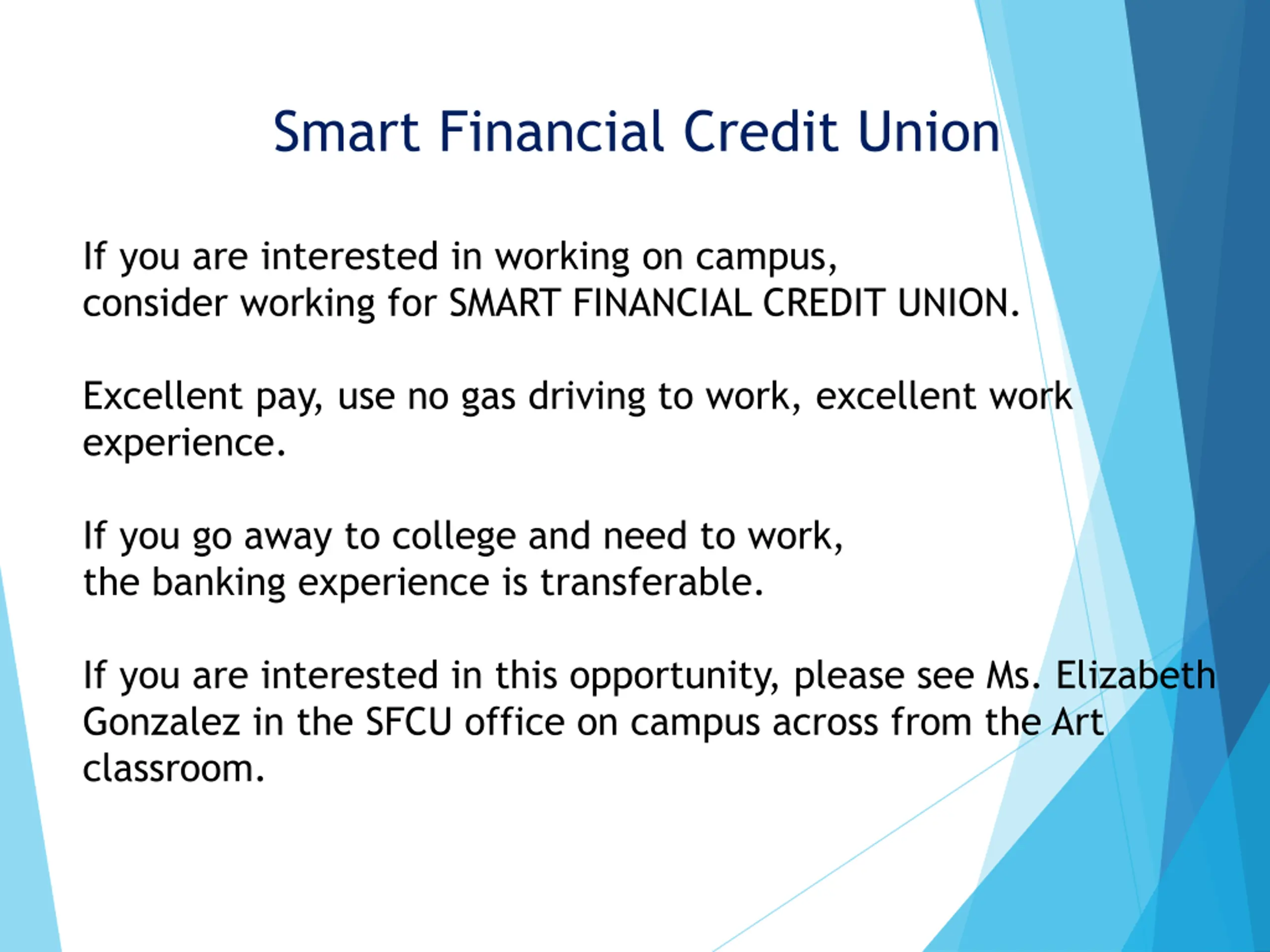 Smart Financial Credit Union If you are interested in working on campus, consider working for SMART FINANCIAL CREDIT UNION. Excellent pay, use no gas driving to work, excellent work experience. If you go away to college and need to work, the banking experience is transferable. If you are interested in this opportunity, please see Ms. Elizabeth Gonzalez in the SFCU office on campus across from the Art classroom.