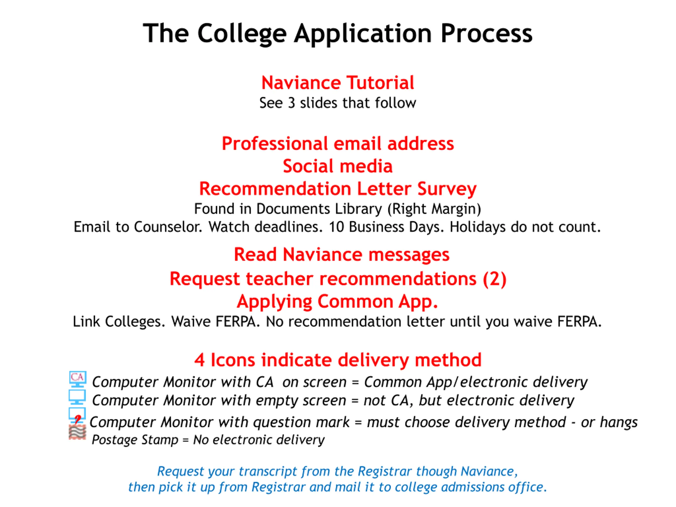 The College Application Process Naviance Tutorial See 3 slides that follow Professional email address Social media Recommendation Letter Survey Found in Documents Library (Right Margin) Email to Counselor. Watch deadlines. 10 Business Days. Holidays do not count. Read Naviance messages Request teacher recommendations (2) Applying Common App. Link Colleges. Waive FERPA. No recommendation letter until you waive FERPA. 4 Icons indicate delivery method Computer Monitor with CA on screen = Common App/electronic delivery Computer Monitor with empty screen = not CA, but electronic delivery ? ?Computer Monitor with question mark = must choose delivery method - or hangs Postage Stamp = No electronic delivery Request your transcript from the Registrar though Naviance, then pick it up from Registrar and mail it to college admissions office.