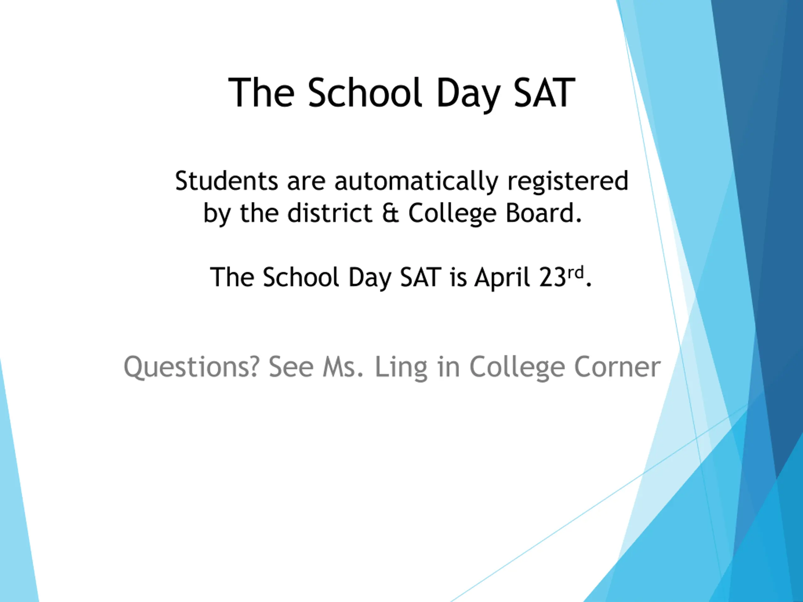 The School Day SAT Students are automatically registered by the district & College Board. The School Day SAT is April 23rd. Questions? See Ms. Ling in College Corner