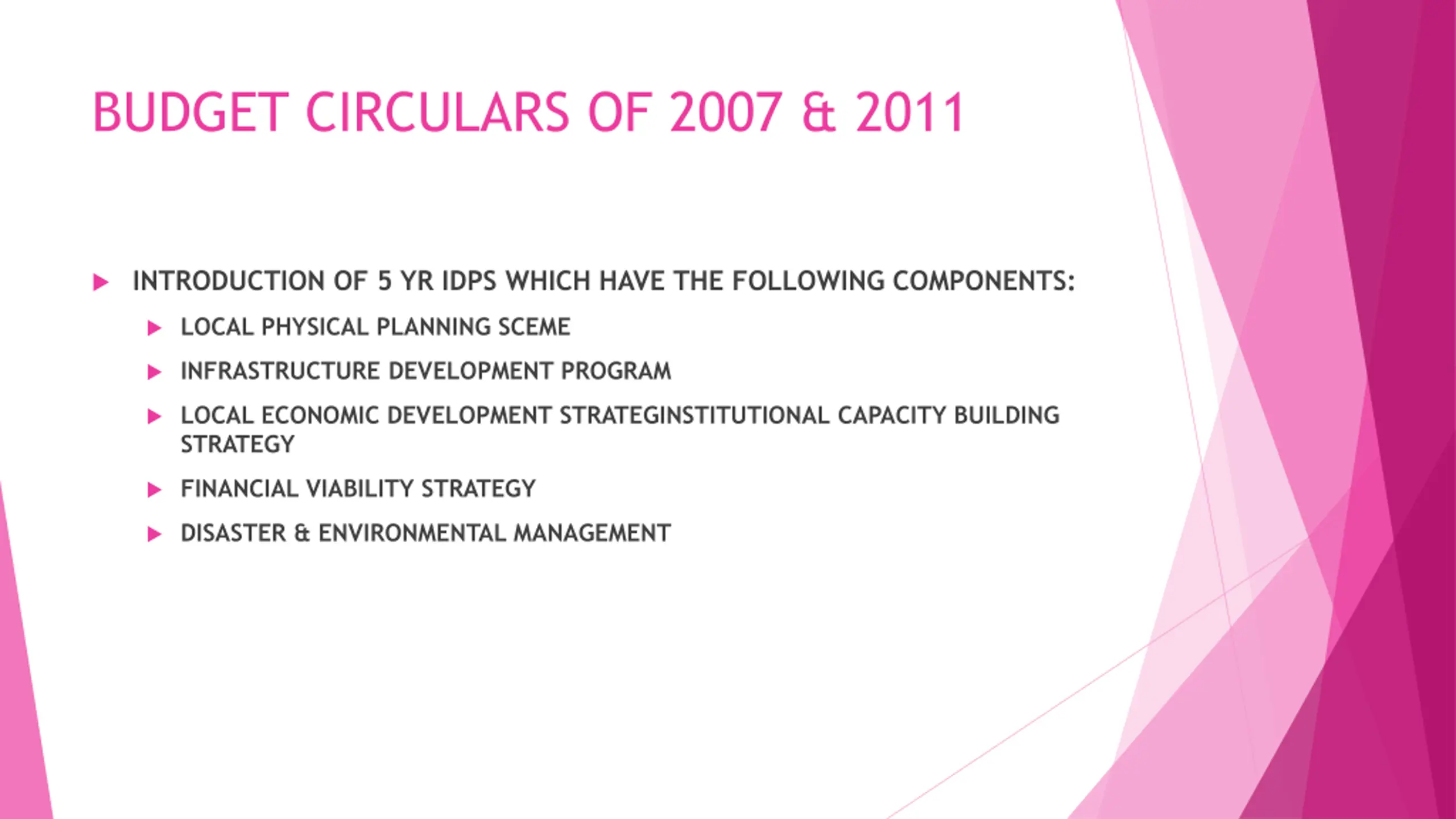 BUDGET CIRCULARS OF 2007 & 2011 INTRODUCTION OF 5 YR IDPS WHICH HAVE THE FOLLOWING COMPONENTS: LOCAL PHYSICAL PLANNING SCEME INFRASTRUCTURE DEVELOPMENT PROGRAM LOCAL ECONOMIC DEVELOPMENT STRATEGINSTITUTIONAL CAPACITY BUILDING STRATEGY FINANCIAL VIABILITY STRATEGY DISASTER & ENVIRONMENTAL MANAGEMENT