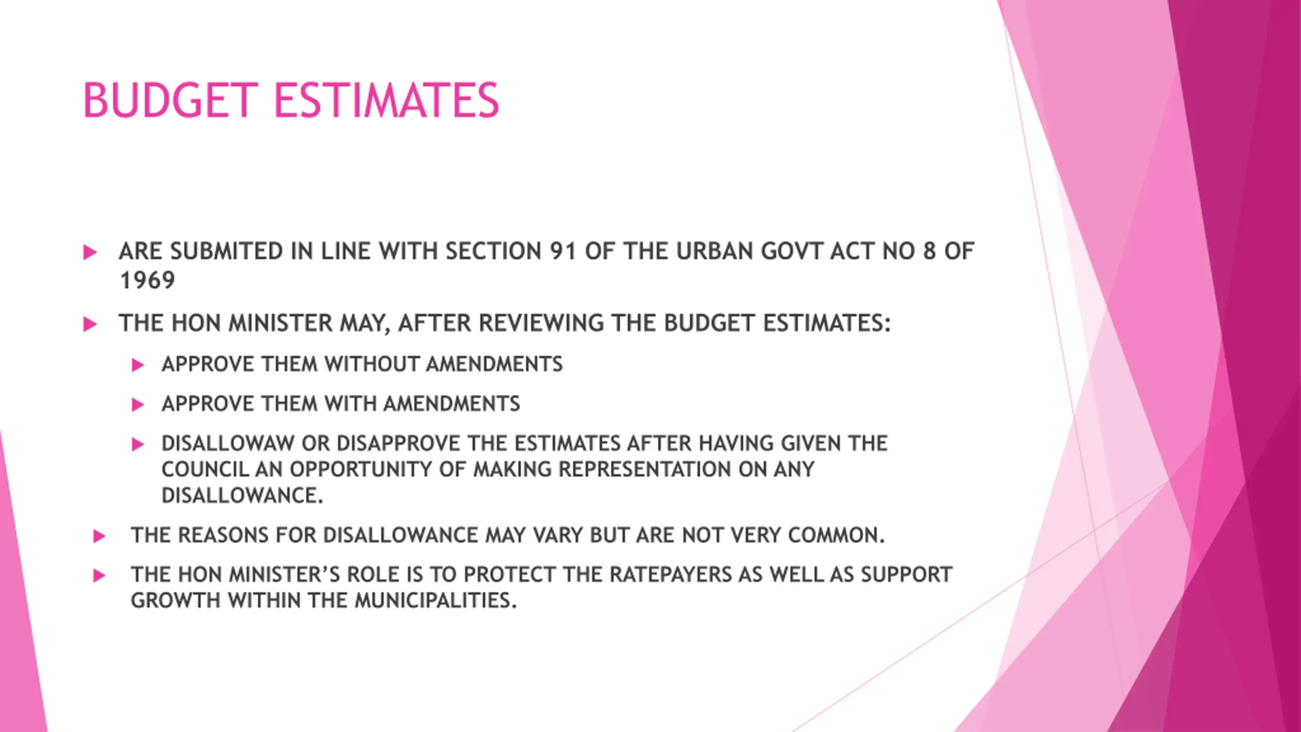 BUDGET ESTIMATES ARE SUBMITED IN LINE WITH SECTION 91 OF THE URBAN GOVT ACT NO 8 OF 1969 THE HON MINISTER MAY, AFTER REVIEWING THE BUDGET ESTIMATES: APPROVE THEM WITHOUT AMENDMENTS APPROVE THEM WITH AMENDMENTS DISALLOWAW OR DISAPPROVE THE ESTIMATES AFTER HAVING GIVEN THE COUNCIL AN OPPORTUNITY OF MAKING REPRESENTATION ON ANY DISALLOWANCE. THE REASONS FOR DISALLOWANCE MAY VARY BUT ARE NOT VERY COMMON. THE HON MINISTER S ROLE IS TO PROTECT THE RATEPAYERS AS WELL AS SUPPORT GROWTH WITHIN THE MUNICIPALITIES.