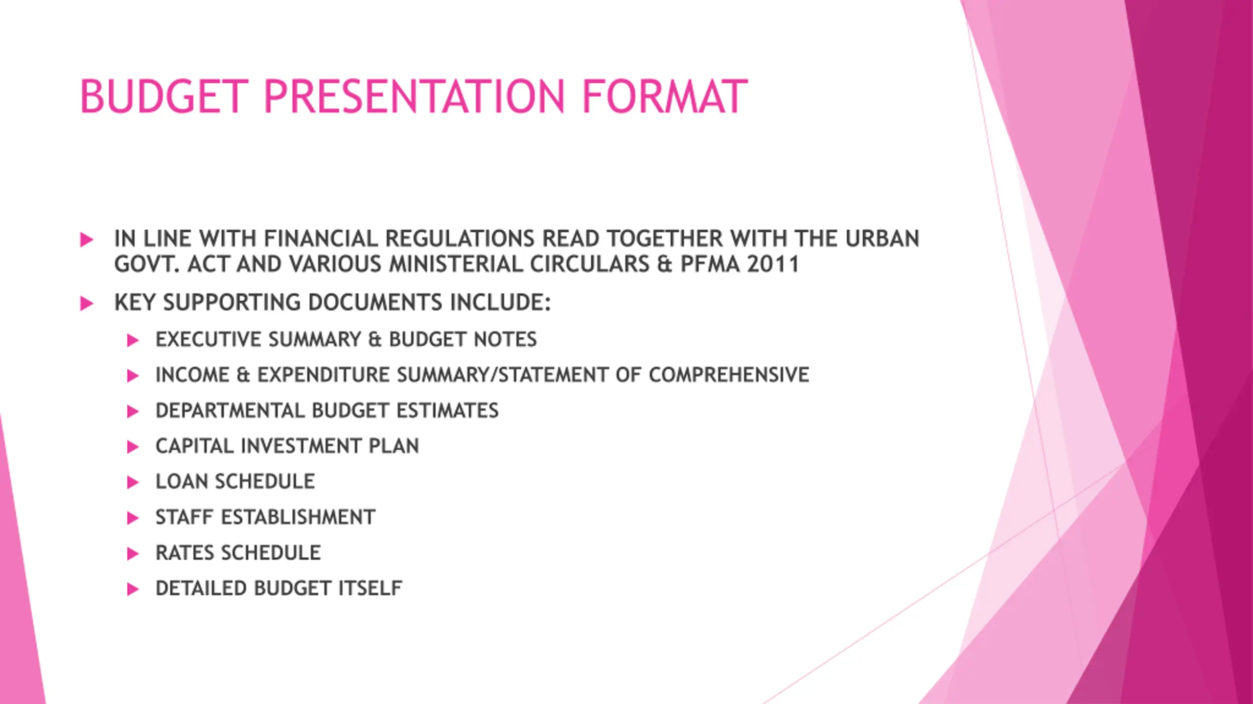 BUDGET PRESENTATION FORMAT IN LINE WITH FINANCIAL REGULATIONS READ TOGETHER WITH THE URBAN GOVT. ACT AND VARIOUS MINISTERIAL CIRCULARS & PFMA 2011 KEY SUPPORTING DOCUMENTS INCLUDE: EXECUTIVE SUMMARY & BUDGET NOTES INCOME & EXPENDITURE SUMMARY/STATEMENT OF COMPREHENSIVE DEPARTMENTAL BUDGET ESTIMATES CAPITAL INVESTMENT PLAN LOAN SCHEDULE STAFF ESTABLISHMENT RATES SCHEDULE DETAILED BUDGET ITSELF
