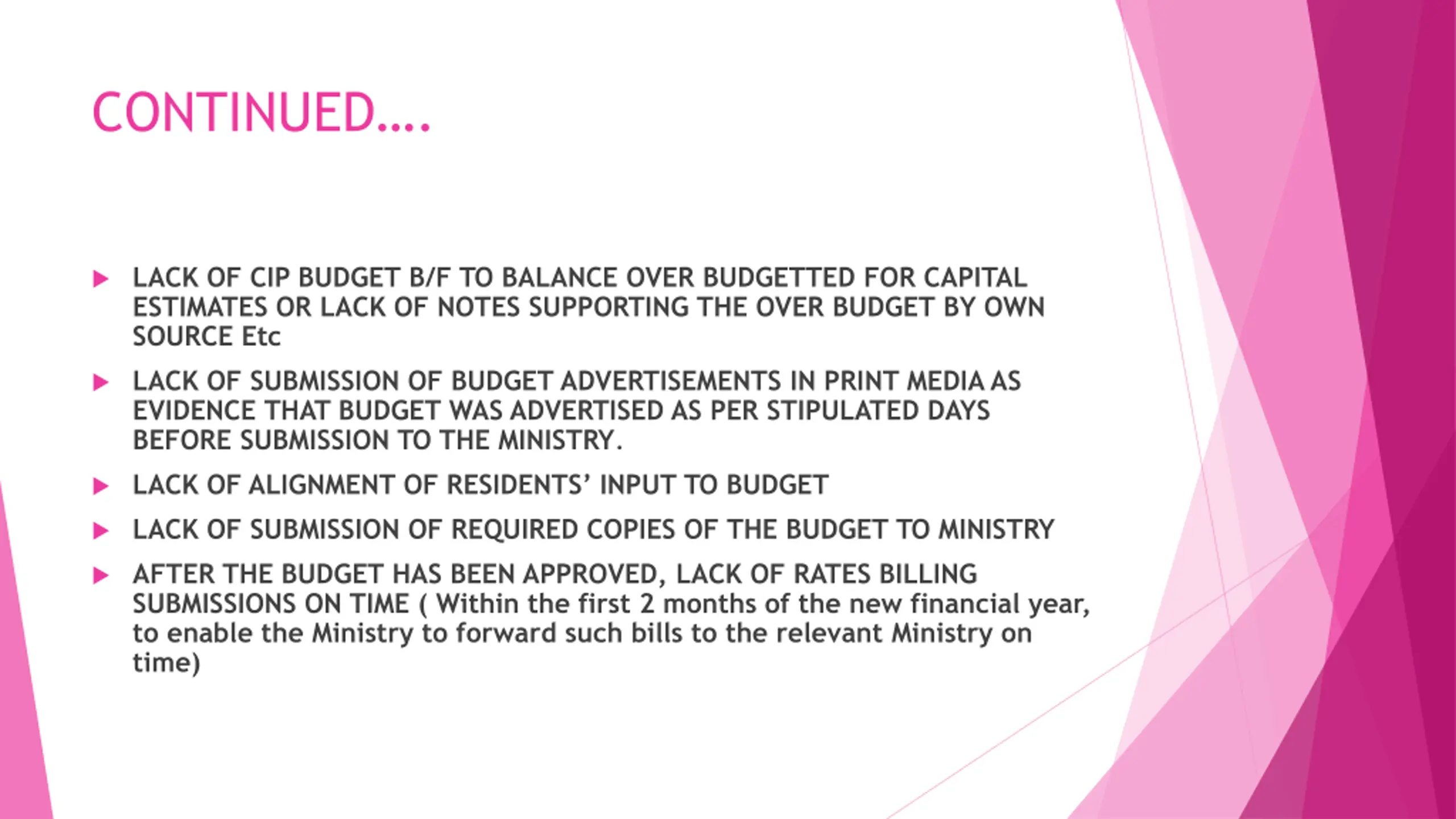 CONTINUED. LACK OF CIP BUDGET B/F TO BALANCE OVER BUDGETTED FOR CAPITAL ESTIMATES OR LACK OF NOTES SUPPORTING THE OVER BUDGET BY OWN SOURCE Etc LACK OF SUBMISSION OF BUDGET ADVERTISEMENTS IN PRINT MEDIA AS EVIDENCE THAT BUDGET WAS ADVERTISED AS PER STIPULATED DAYS BEFORE SUBMISSION TO THE MINISTRY. LACK OF ALIGNMENT OF RESIDENTS INPUT TO BUDGET LACK OF SUBMISSION OF REQUIRED COPIES OF THE BUDGET TO MINISTRY AFTER THE BUDGET HAS BEEN APPROVED, LACK OF RATES BILLING SUBMISSIONS ON TIME ( Within the first 2 months of the new financial year, to enable the Ministry to forward such bills to the relevant Ministry on time)