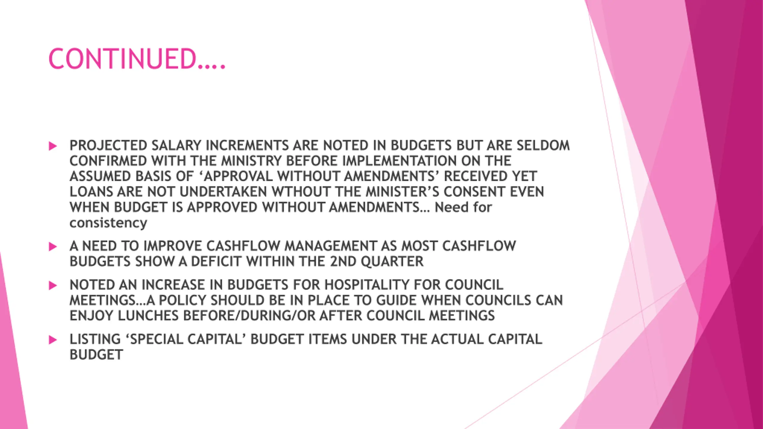CONTINUED. PROJECTED SALARY INCREMENTS ARE NOTED IN BUDGETS BUT ARE SELDOM CONFIRMED WITH THE MINISTRY BEFORE IMPLEMENTATION ON THE ASSUMED BASIS OF APPROVAL WITHOUT AMENDMENTS RECEIVED YET LOANS ARE NOT UNDERTAKEN WTHOUT THE MINISTER S CONSENT EVEN WHEN BUDGET IS APPROVED WITHOUT AMENDMENTS Need for consistency A NEED TO IMPROVE CASHFLOW MANAGEMENT AS MOST CASHFLOW BUDGETS SHOW A DEFICIT WITHIN THE 2ND QUARTER NOTED AN INCREASE IN BUDGETS FOR HOSPITALITY FOR COUNCIL MEETINGS A POLICY SHOULD BE IN PLACE TO GUIDE WHEN COUNCILS CAN ENJOY LUNCHES BEFORE/DURING/OR AFTER COUNCIL MEETINGS LISTING SPECIAL CAPITAL BUDGET ITEMS UNDER THE ACTUAL CAPITAL BUDGET