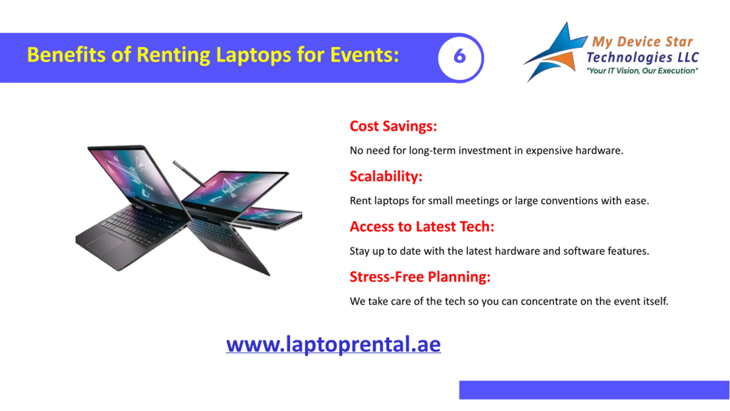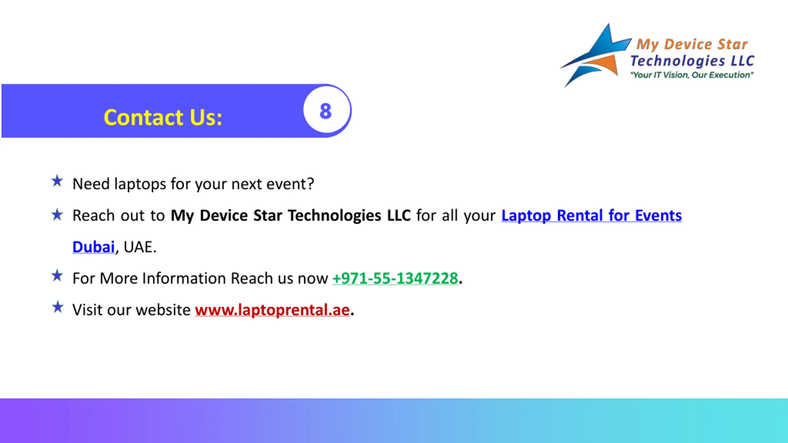 8 Contact Us: Need laptops for your next event? Reach out to My Device Star Technologies LLC for all your Laptop Rental for Events Dubai, UAE. For More Information Reach us now +971-55-1347228. Visit our website www.laptoprental.ae.