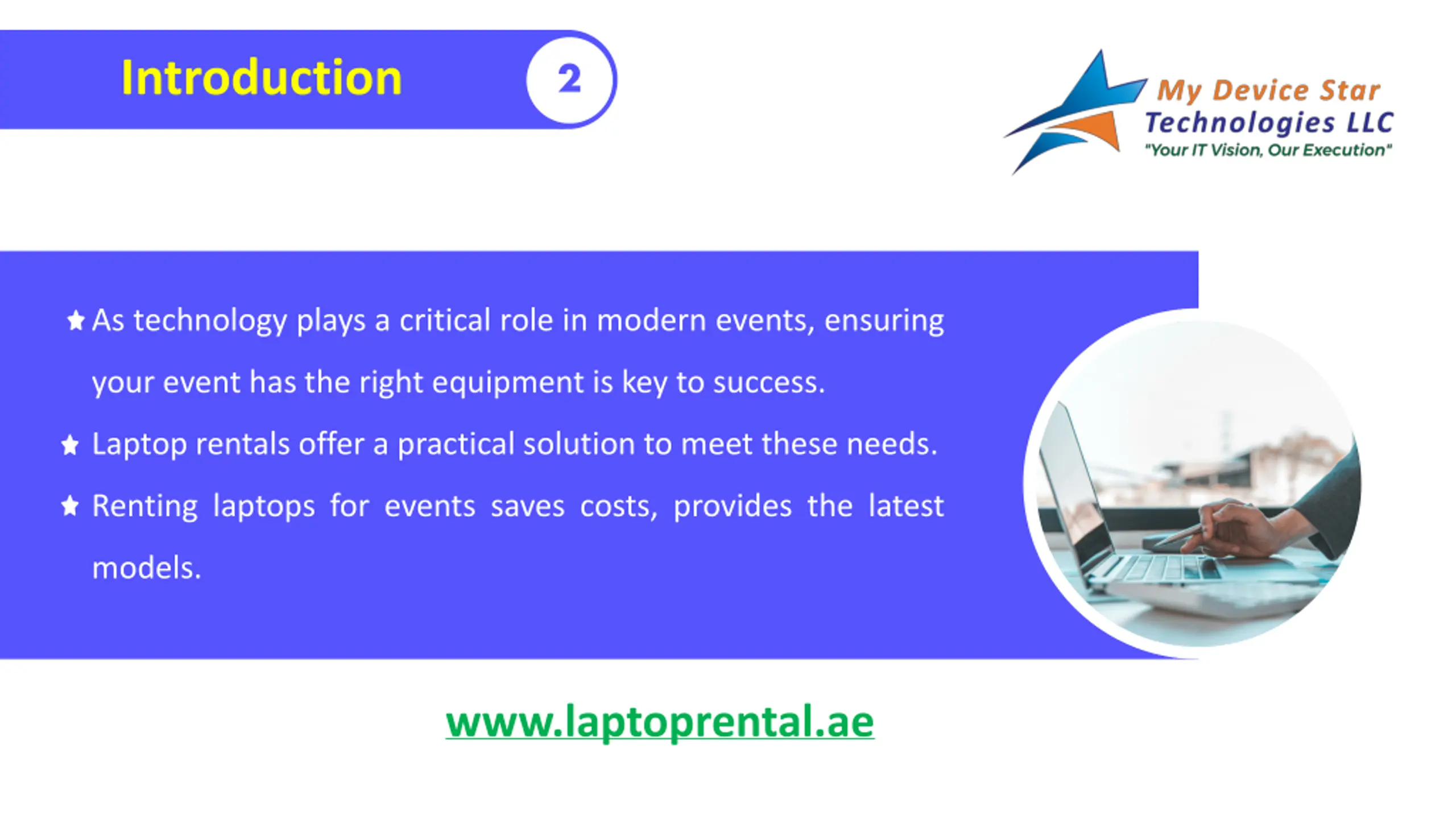 Introduction 2 As technology plays a critical role in modern events, ensuring your event has the right equipment is key to success. Laptop rentals offer a practical solution to meet these needs. Renting laptops for events saves costs, provides the latest models. www.laptoprental.ae