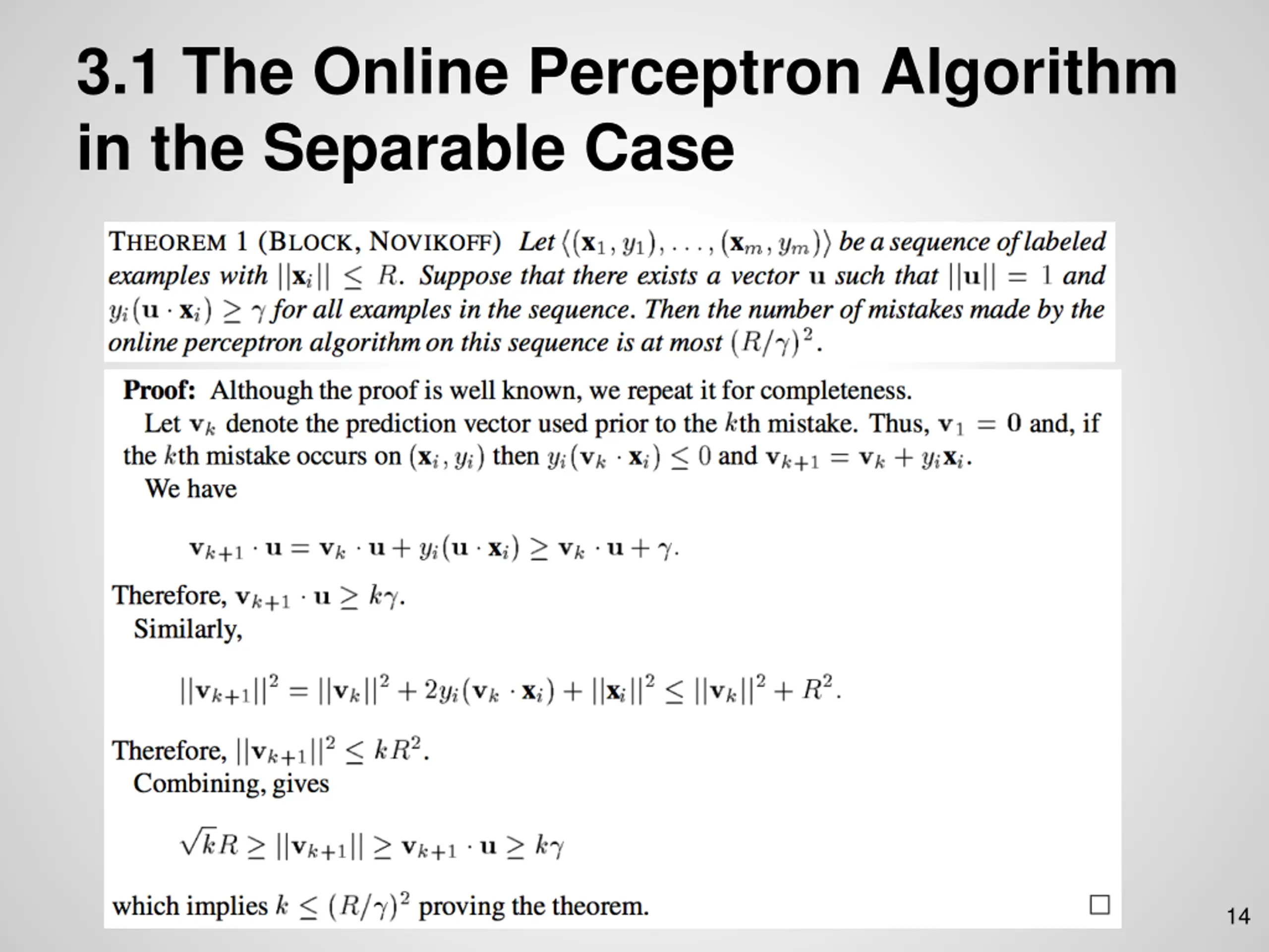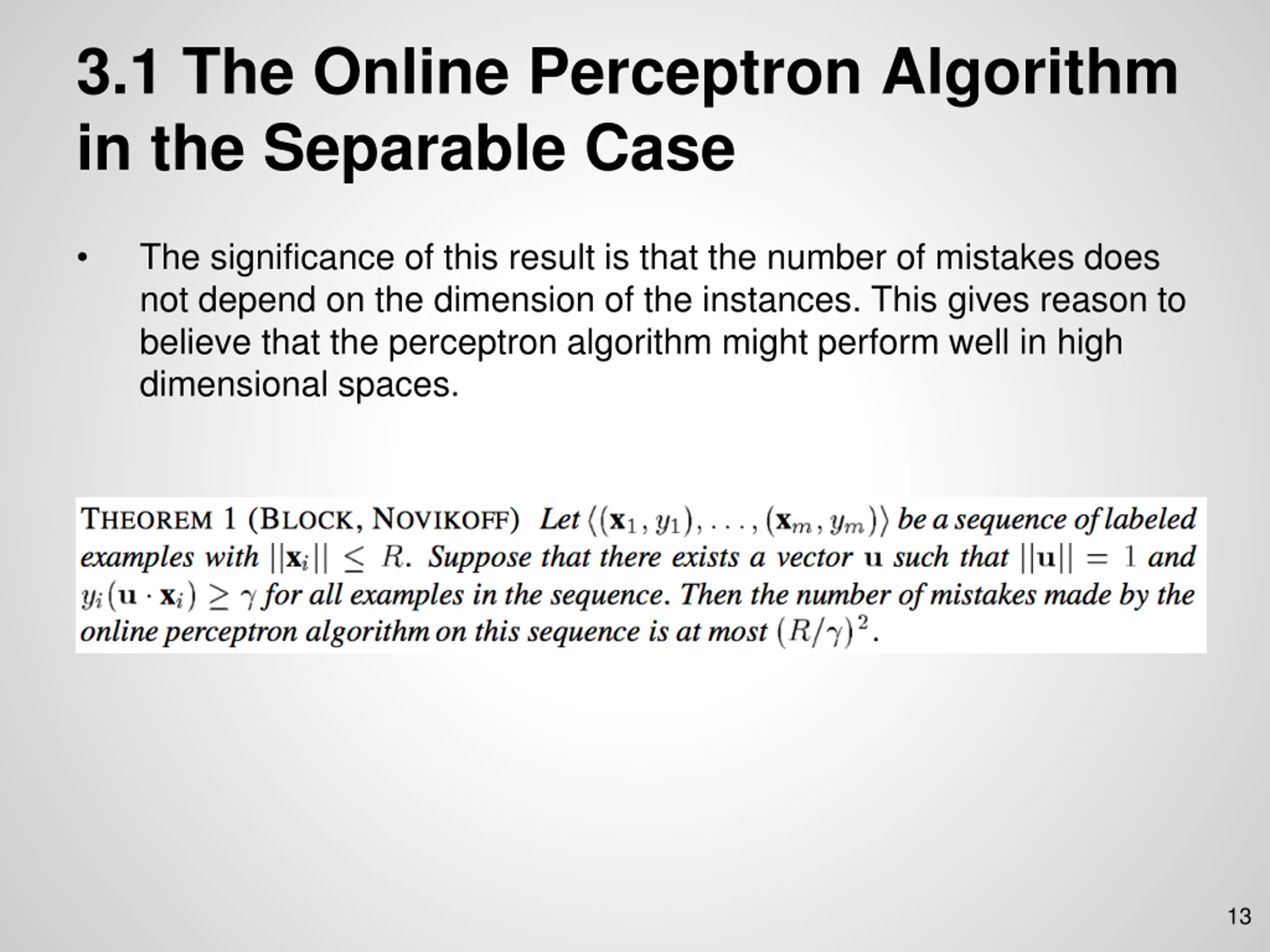 3.1 The Online Perceptron Algorithm in the Separable Case The significance of this result is that the number of mistakes does not depend on the dimension of the instances. This gives reason to believe that the perceptron algorithm might perform well in high dimensional spaces. 13
