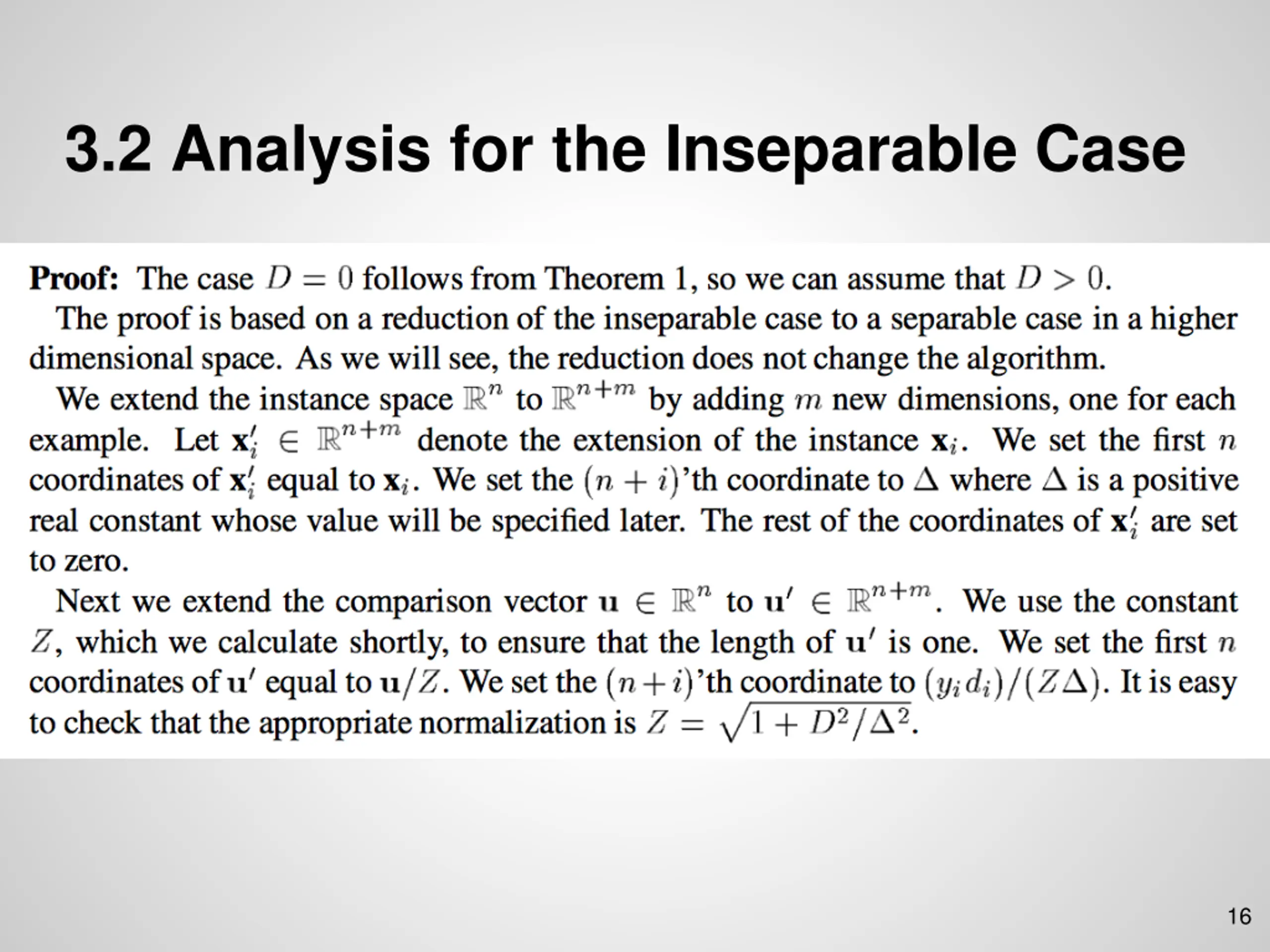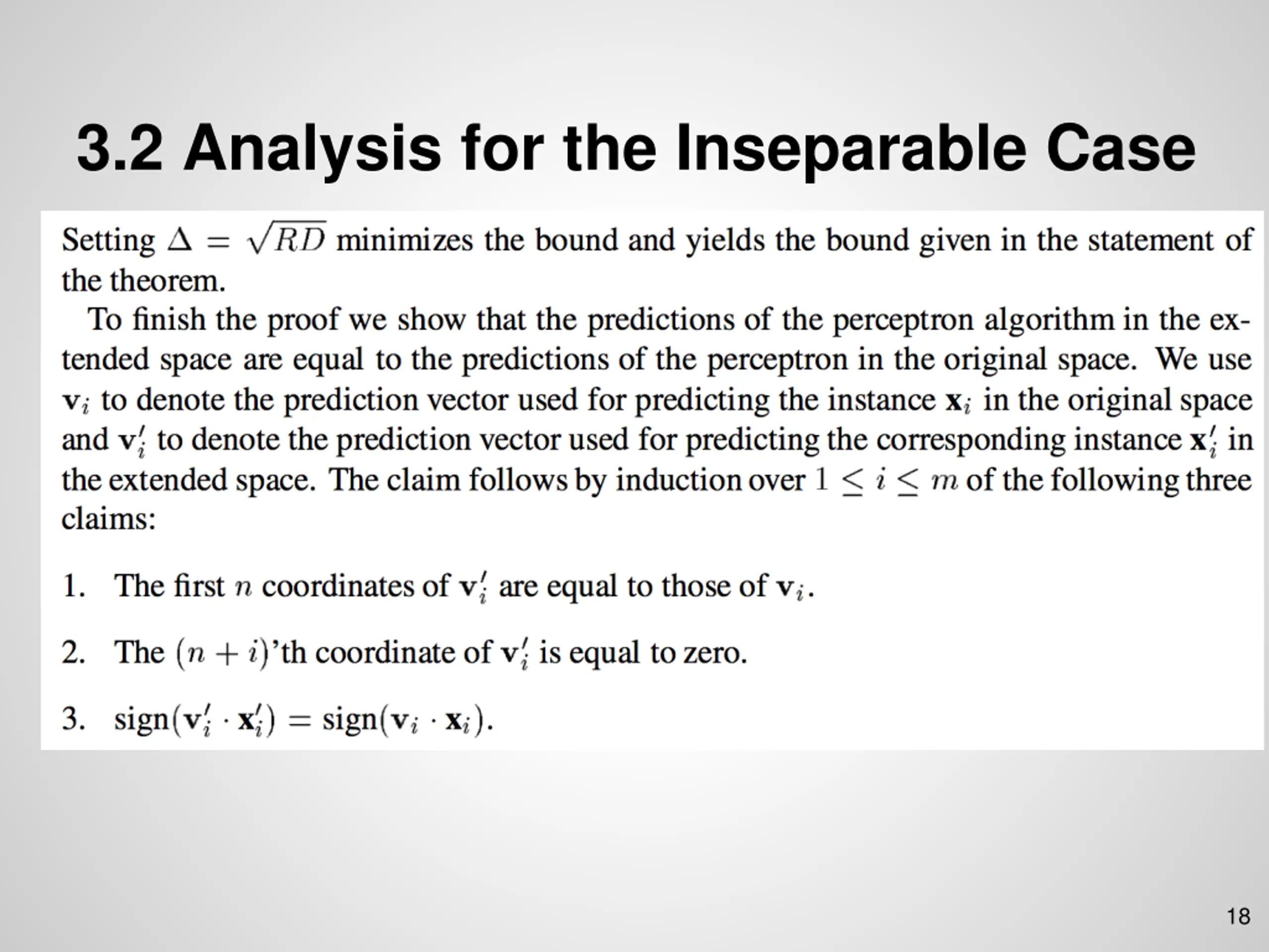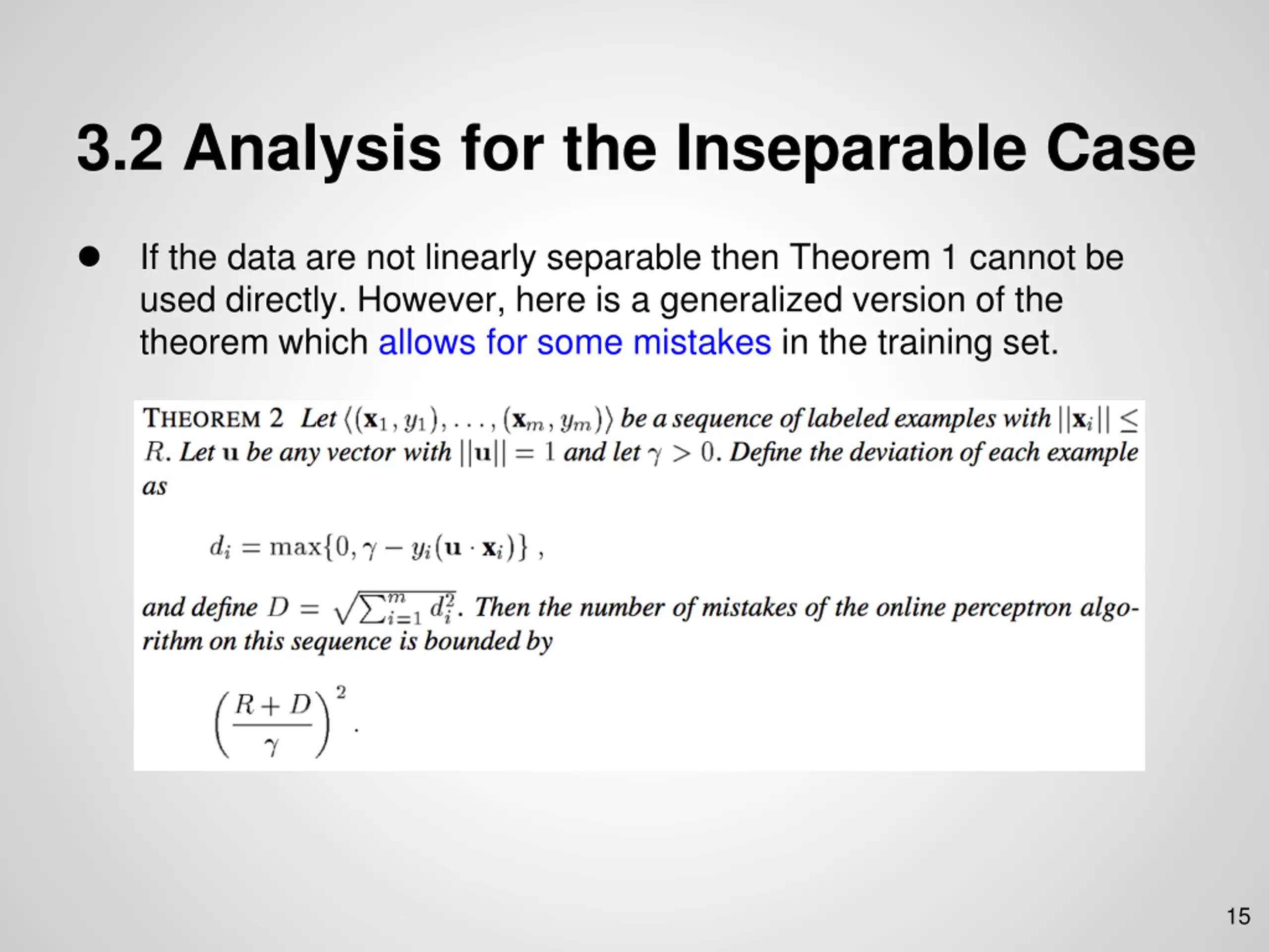 3.2 Analysis for the Inseparable Case If the data are not linearly separable then Theorem 1 cannot be used directly. However, here is a generalized version of the theorem which allows for some mistakes in the training set. 15